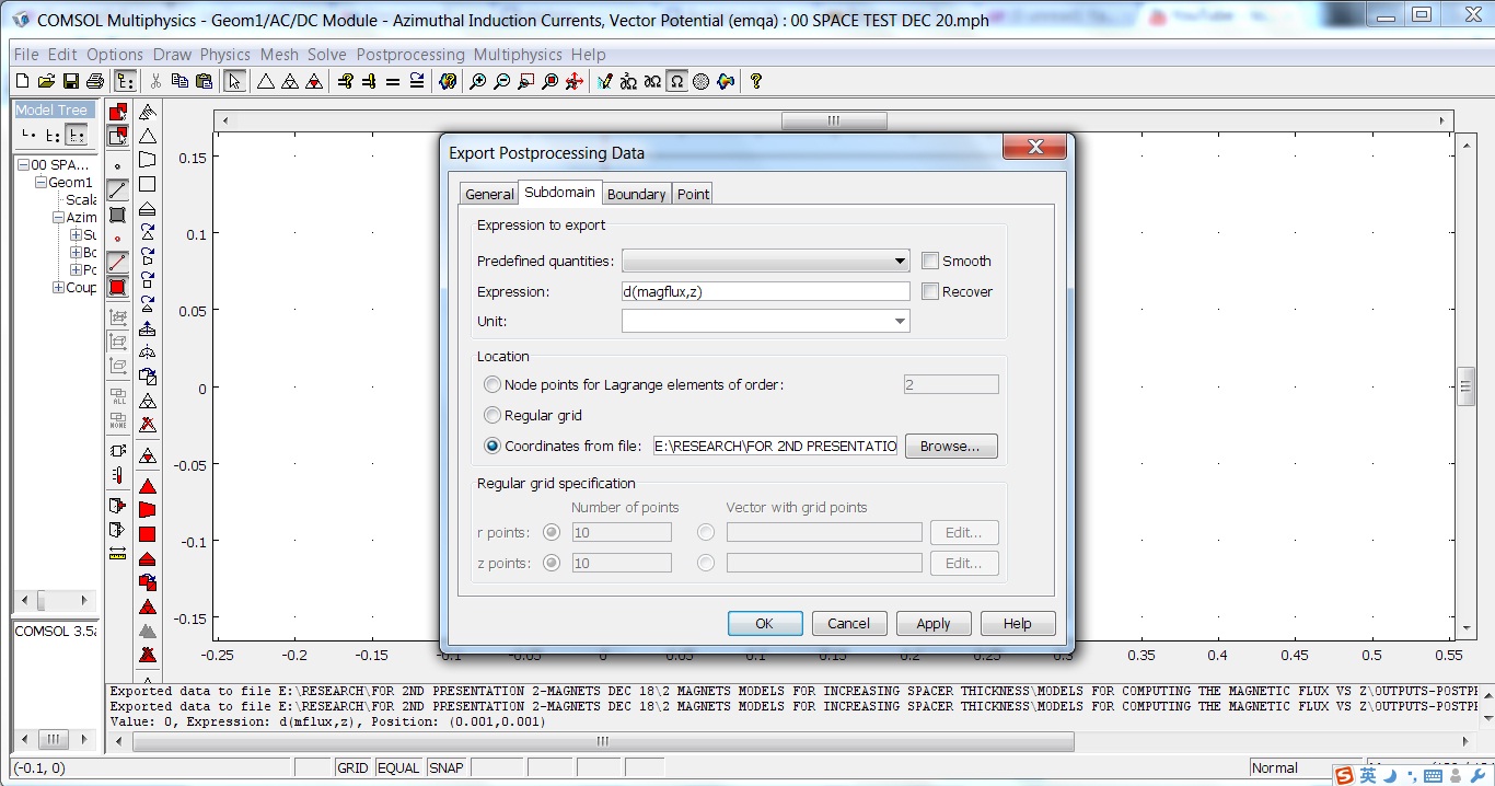 I also tried defining a extrusion coupling variable name dmagflux, defined by d(magflux,z) and made it available in all the domains, but when in the EXPORT POSTPROCESSING DATA>SUBDOMAIN> EXPRESSION FIELD I write dmagflux when I export the data only zeros appear in the column of the derivative data, the same if I write there d(magflux,z), and also if I try to do it manually in the POSTPROCESSING>DATA DISPLAY>SUBDOMAIN field.