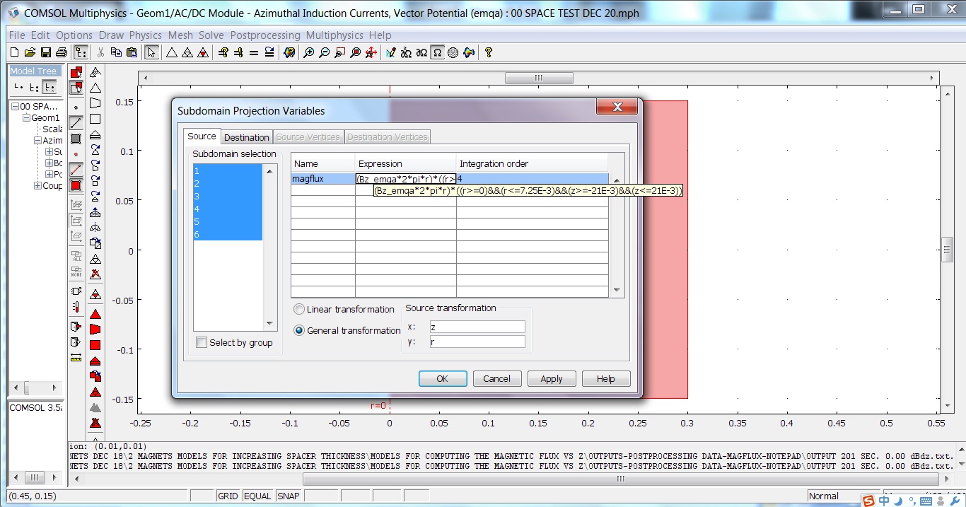 magflux: (Bz_emqa*2*pi*r)*((r>=0)&&(r=-21E-3)&&(zSUBDOMAIN> EXPRESSION FIELD I write dmagflux when I export the data only zeros appear in the column of the derivative data, the same if I write there d(magflux,z), and also if I try to do it manually in the POSTPROCESSING>DATA DISPLAY>SUBDOMAIN field.