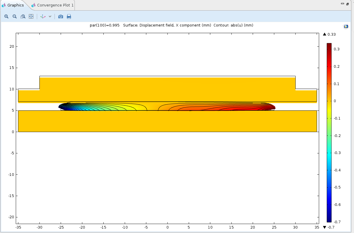 When I work with a thin elastic layer, the region of the polymer that comes into contact is pulled back to its initial x-coordinate and not fixed at the x-coordinate where the parts come into contact as you can see in the second picture where the displacement in x-direction is displayed.
