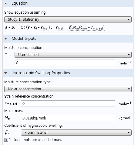 By the way, you can also select to give the input in terms of mass concentration. Either way, the humidity in in the surrounding air serves as a boundary condition for the moisture concentration in the solid you will analyze. It is not trivial how to transform the values in the surrounding air to values inside the solid. The discussion in the documentation for this example: https://www.comsol.com/model/mems-pressure-sensor-drift-due-to-hygroscopic-swelling-21021 will probably be of interest. Regards, Henrik