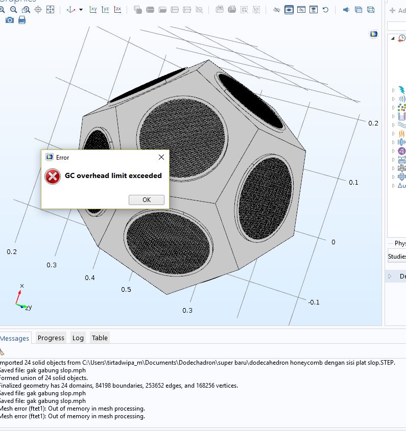 I want to get a directivity of dodecahedron loudspeaker with Comsol simulation. My simulation model is set up using a combination of the Magnetic Fields interface and the Acoustic-Structure Interaction multiphysics interface. And, I import file from Solidworks ( for geometry). For an information, dodecahedron loudspeaker is 12 driver ( loudspeaker) in the dodecahedron shape. When I meshing this geometry, I have an error "out of memory in mesh memory ". Maybe, anyone can help me to discuss or show me how to simulate it ?