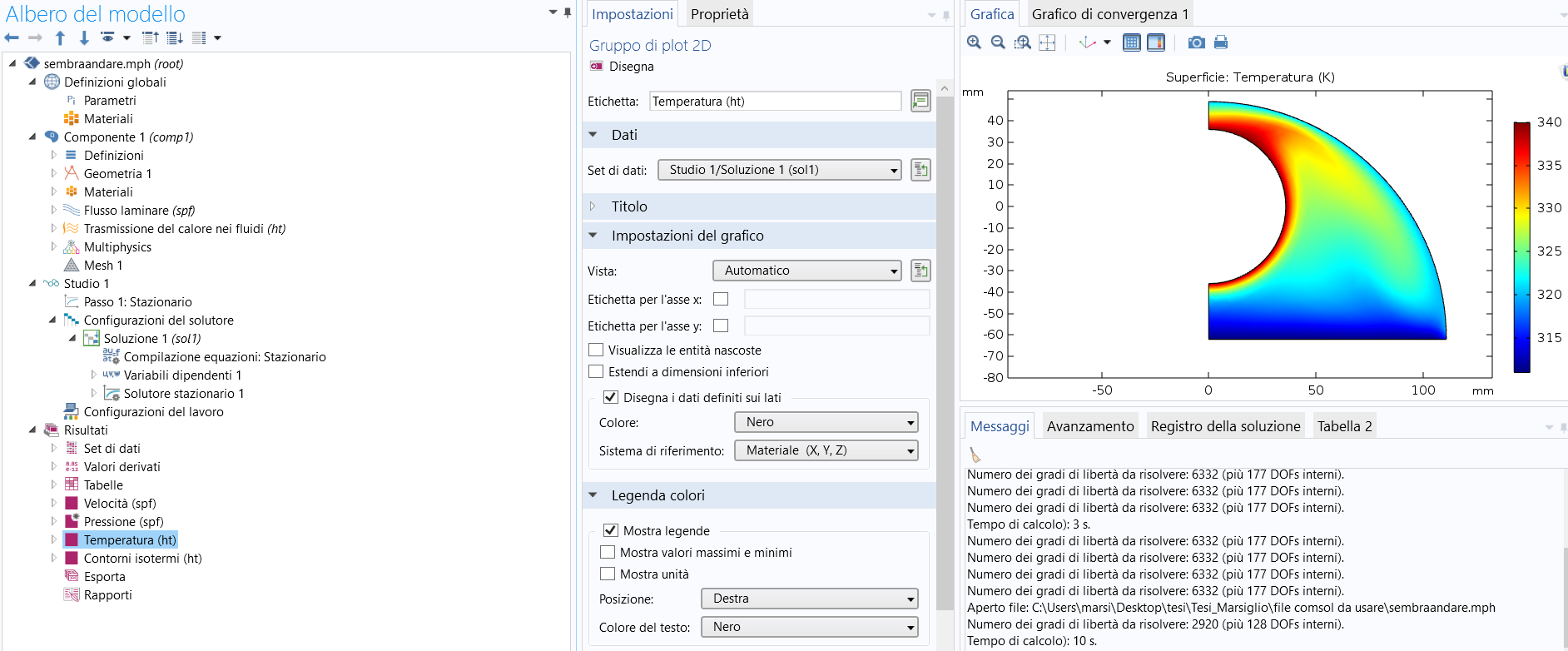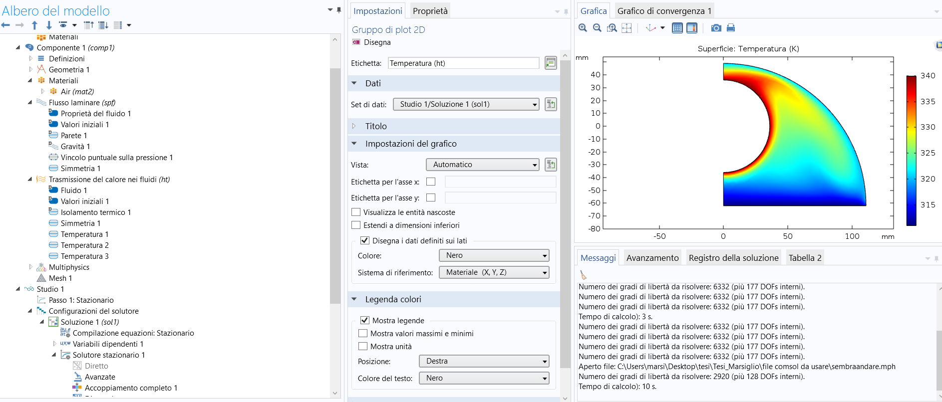 I'm having some problems trying to work on a quite simple model, that you can see attached. 3 of the walls (half tube, and the 2 pieces of carter) have 3 different temperatures and there is air in the middle. I would like to know the exchange of energy between the 3 elements due to convection and I'm using a stationary solver. The strange thing is that I was able to have a solution for a lot of initial conditions but sometimes, changing the temperature, the model doesn't work anymore giving the following error: Undefined value found in the equation residual vector. There are 260 degrees of freedom giving NaN/Inf in the vector for the variable comp1.T. at coordinates: (0.11073,-0.054257), (0.110392,-0.0503973), (0.110246,-0.0612593), (0.110176,-0.0575849), (0.109958,-0.053865), ... There are 447 degrees of freedom giving NaN/Inf in the vector for the variable comp1.u. at coordinates: (0,-0.062), (-5.08159e-020,-0.0612062), (-1.11795e-019,-0.0602536), (0.00382759,-0.062), (0.11073,-0.054257), ... There are 447 degrees of freedom giving NaN/Inf in the vector for the variable comp1.v. at coordinates: (0,-0.062), (-5.08159e-020,-0.0612062), (-1.11795e-019,-0.0602536), (0.00382759,-0.062), (0.11073,-0.054257), ...