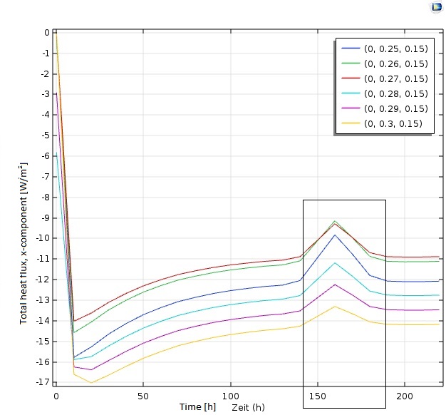 The problem with the simulation is that the heat flux in X-direction is way smaller than it should be on the surface as well as the time when the heat source is active doesn´t fit. In the attached graph the error is more easy to be seen.