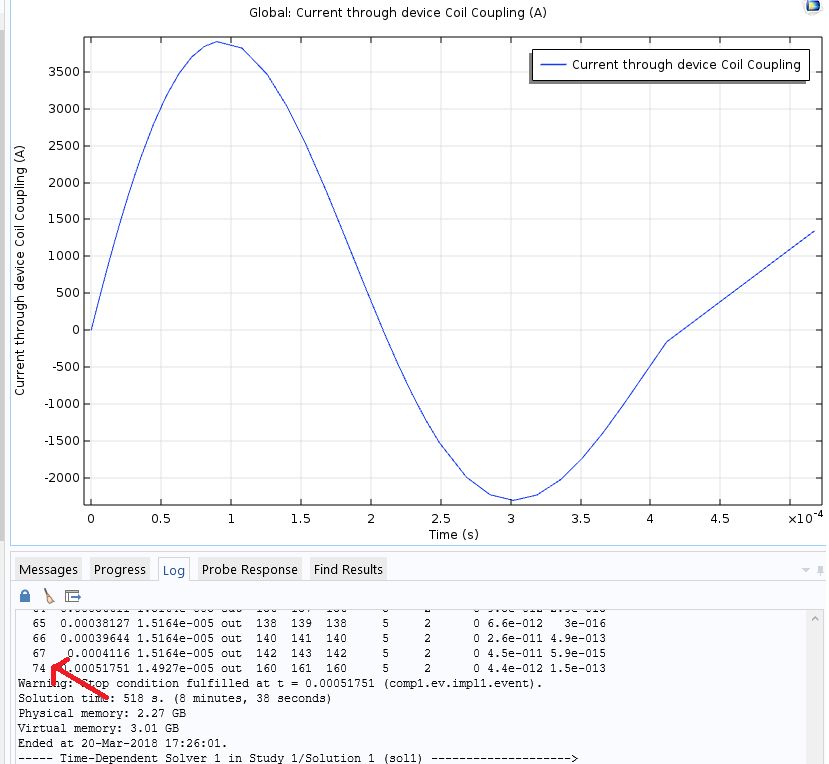 I have a strange result in a time dependent simulation using the AC/DC magnetic fields module. The solver seems to skip from step 67 to step 74, and the output jumps in a unrealistic way.