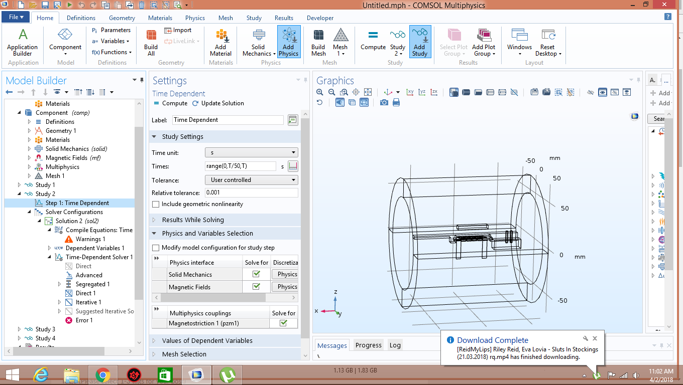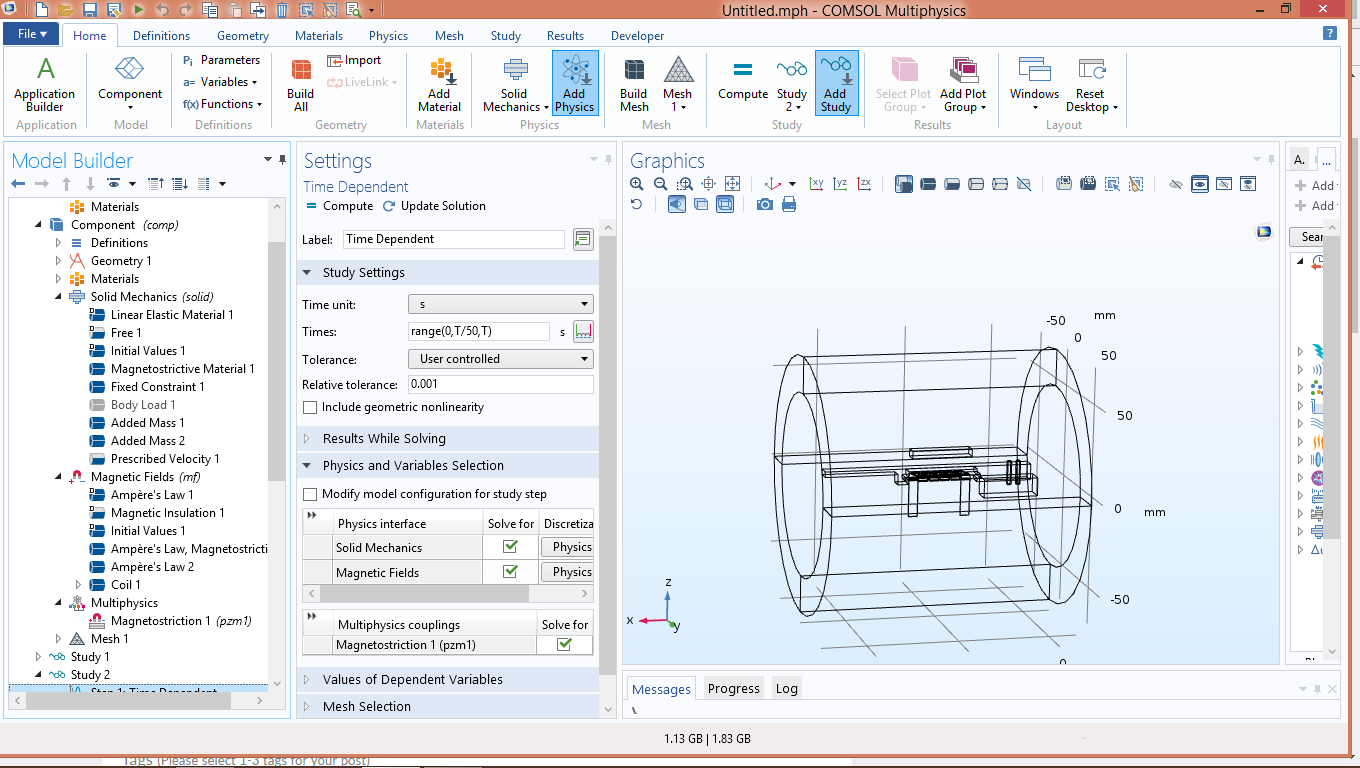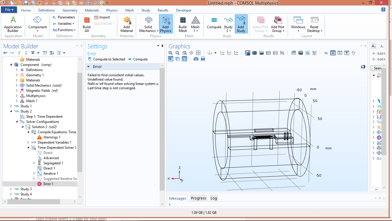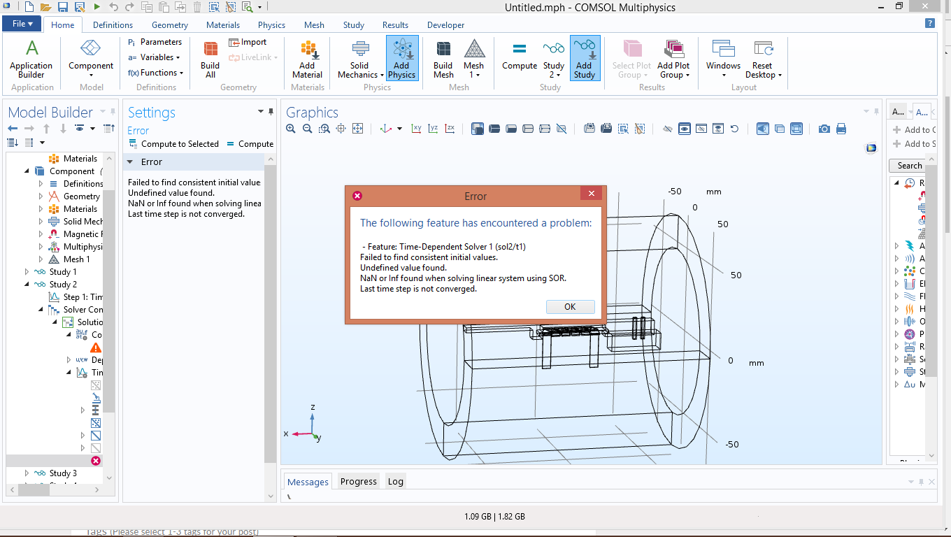 I have developed a magnetostrictive energy harvester in 3d comsol model . I am using a sinusoidal velocity to vibrate its tip continuously. when i run the model in stationary study there is no problem but in time domain it is shownig this error message ---" Failed to find consistent initial values. Undefined value found. NaN or Inf found when solving linear system using SOR. Last time step is not converged"