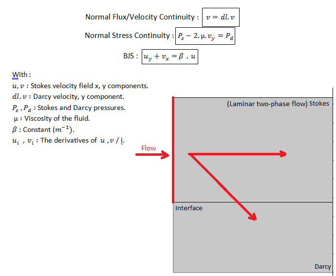 Hi everyone, Working on Stokes-Darcy coupling of two simple rectanglar 2D domains, the fluid flows in the Stokes domain first then penetrates into Darcy's, there are three simple equations that must be applied in the interface between the two physics : 1/ Continuity of the normal flux/velocity, 2/ Continuity of normal Stress and finally 3/ Beaver-Joseph-Saffman (BJS) ... the attached image shows the simpliest forms of these equations. My question is, what is the most efficient way to implement these three equations ? Thanks in advance.