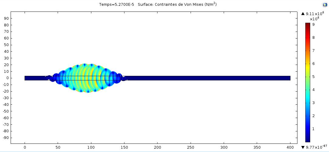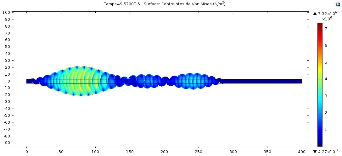 Hi, I am working on lamb wave propagation in steel plate. I am using comsol 5. In attachments you find the propagation of A0 lamb mode in plate with symmetric internal rectangular defect. After the interaction of lamb wave with defect, a part of the wave is reflected, the second part is transmitted. As the defect is symmetric, normally there will not be a conversion, however in my simulation I have got two waves transmitted. I want you to guide me to correct my model. I