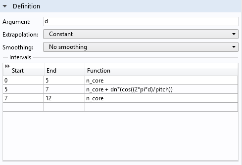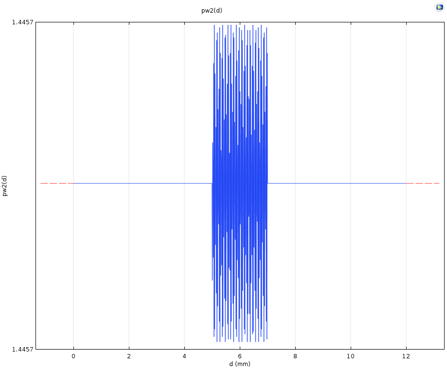 Right now, I am working on simulating a simple optical fiber, wherein a bragg grating is inscribed. Currently, I am using a piecewise function to modulate the refractive index of the core. Figure 1 shows a plot of the function used: At the beginning the refractive index equals some specified constant. After 5 mm the modulation starts. At 7 mm the refractive index is again constant. Figure 2 shows the definition of the function. The parameter n_core is simply a constant, dn is the "strength" of the modulation and equals , d is actually a "dummy" variable which should represent the space dependence along the z-direction. Unfortunately I was not able to figure out how to use the real global coordinate z as argument (maybe someone can help me with that too). The last parameter is the pitch, which has a value such that the reflected wavelength equals . Using the governing equation for that, the value of the pitch equals approximately . Figure 3 shows how I tried to use that function as a material property for the core of the optical fiber.