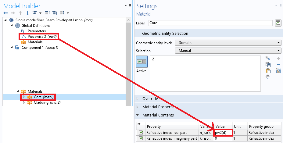 Using piecewise function as material property for modelling Fiber Bragg Gratings