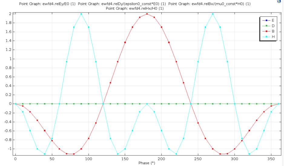 However, image3 shows the plot of relEy, relDy, relBx and relHx (normalized to the amplitude of the bakground fields). They are calculated at the red point in image1 and the x-axis represents the phase of the solution (calculated with a Frequency Domain study). E and D behave as expected (no "rel" fields), but I get a "wrong behaviour" for B and H: relBx and relHx should also be zero. Assuming they were not zero, at least I expect them to be proportional (in vacuum), but also this is not true.