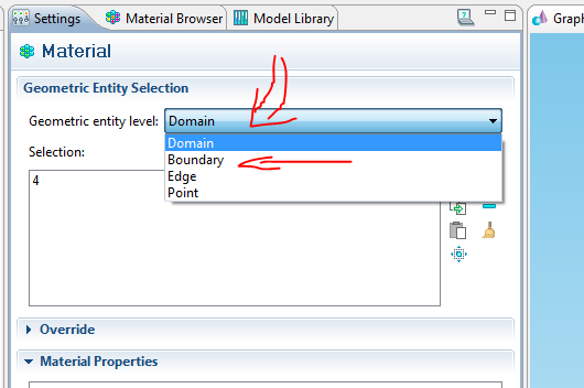 " As by default in COMSOL the boundaries do NOT heritage the domain material properties, particularly because in "union" mode, you have a common boundary for two adjacent domains, so COMSOL cannot choose by itself which of the two materials to set on the common boundary between the two materials.
