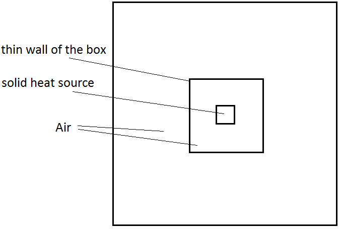I have to model object with solid heat source. This heat source must be in the box with very thin walls. I would like to observe heat transfer from heat source to the box and then to the air. Later it will be used to study cooling of the casing.