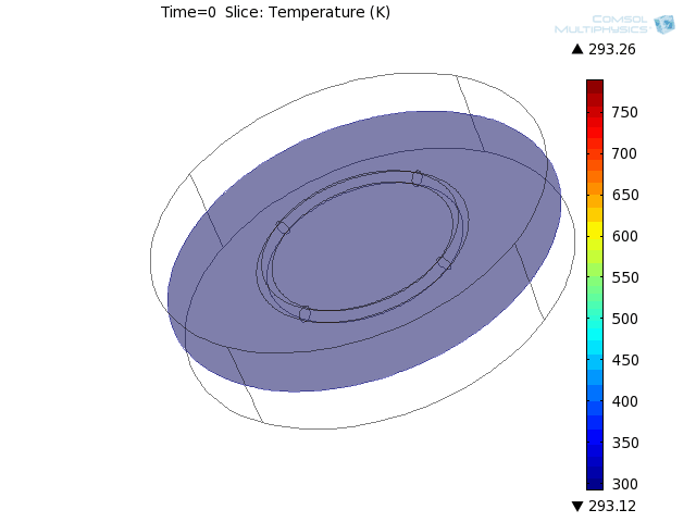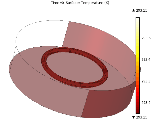 [QUOTE] Div(j) = Qj does not refer to the heat generation, it refers to the rate of change of charge density (or current density). The heat generated is calculated as Jh.Qrh = J.E. That’s the equation that you need to change. I am curious to know if that change works, because I still personally prefer splitting the ring as you described! [/QUOTE] Where am I supposed to change this equation? I clicked the show node at the upper part of the bar where it says Model Builder, and selected the Equation View. Then the equation view nodes in all physics nodes appeared; so I chose the Joule Heating one to see if there is anything similar to waht you said that I should change - but there appear to be quite a lot of equations there. in the Jh.Qrh the expression is jh.Jx*E1+jh.Jy*E2+jh.Jz*E3 . assuming that E1,2,3 corresponds to the Jx,y,z, isn't this the same equation as you suggested? ...either way, I doubt this is the cause for the problem. once again, I see no reason for the program, even in this form, to give me a non-symmetrical solution. According to your advice, I figured it can't do any harm to rebuild the model, so I have, and I created once again the GIF file of the results - a horizontal slice(temperature), from time 0 to 1000(attached). here too, there seem to be two spots that look like their initial temperature was different. I will try what you said with the step-function in the current in a few hours, but till then, thank you both very much for your time investment here! :) ~Shoval