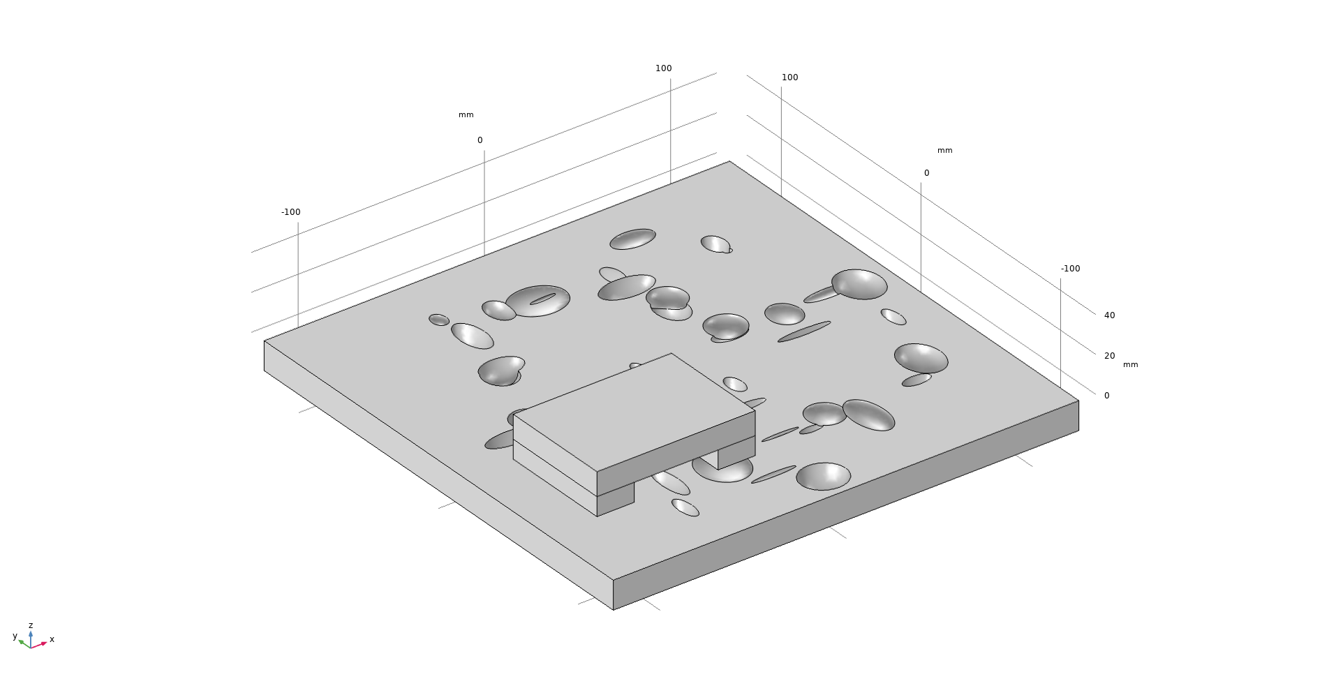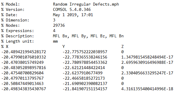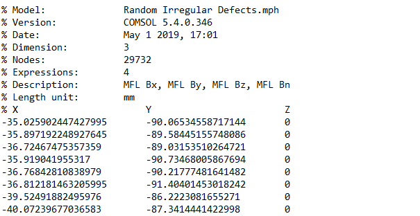 I have been working with Comsol 5.3 for over four months now, trying to simulate Magnetic Flux Leakage. I modelled a 250mm by 250 mm steel plate with random ellipsoidal shapes that are subtracted from the plate to simulate metal loss defects. I also modelled a pair of magnets joined by an iron core. I am running a parametric sweep in which the magnets and the core move along the x axis from negative to positive. Finally, I export the results to a single text file.