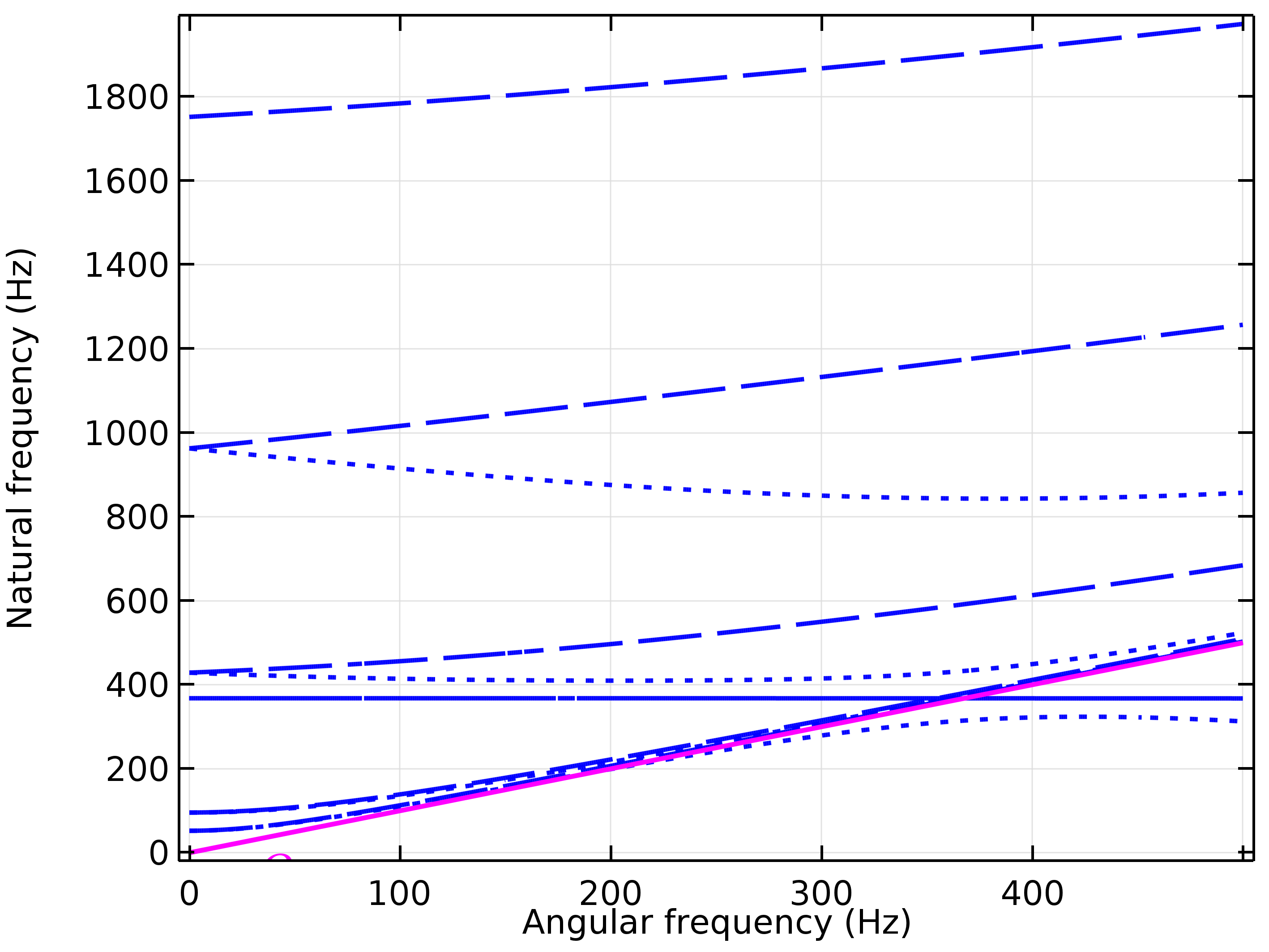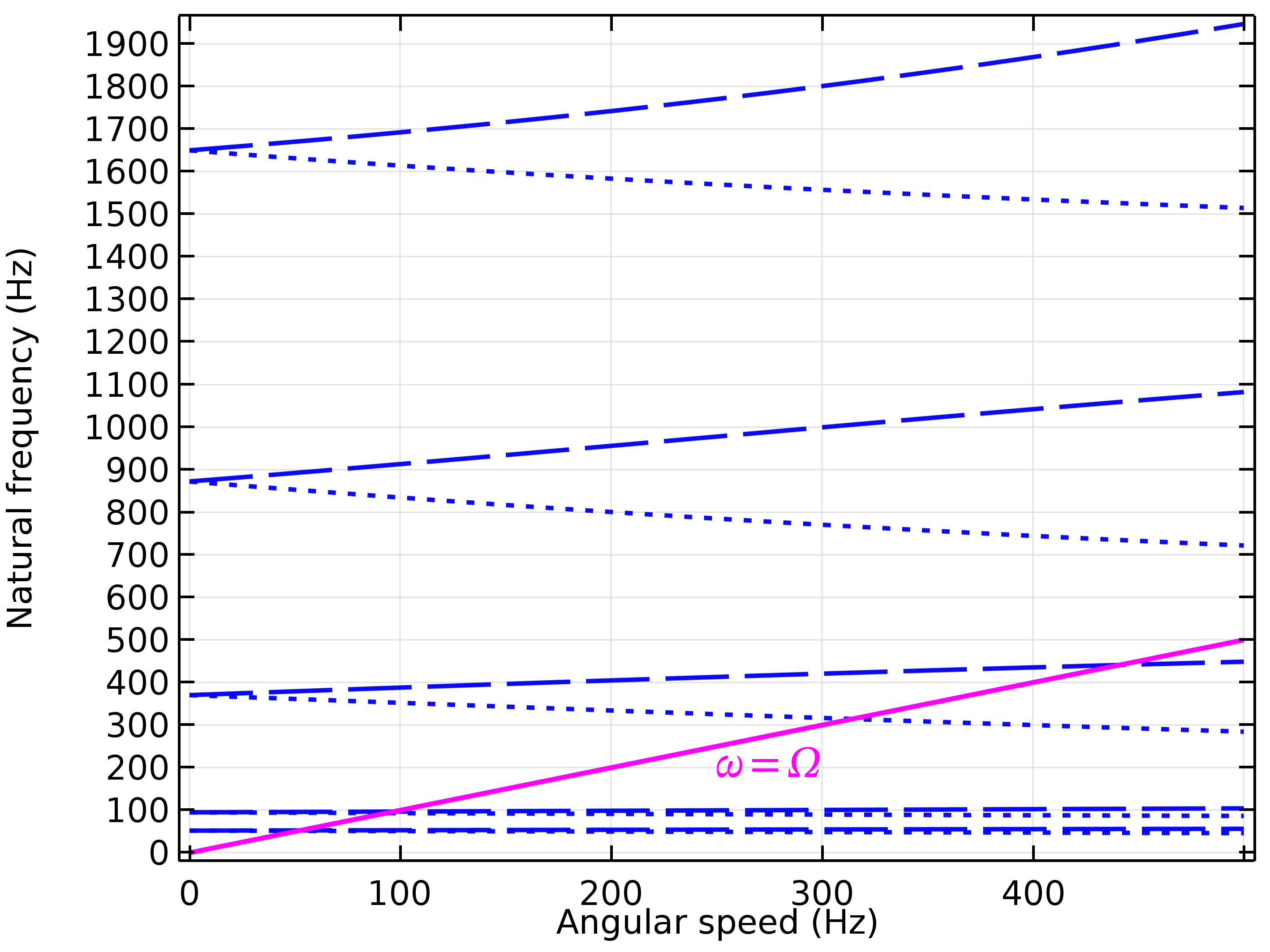 I am trying to calculate the eigenfrequency and modal shape of a rotor by using Solid Rotor(rotsld, the rotor is modeled by solid elements) in Rotor Dynamic Module. When I evaluate the results, it turns out that when the rotational speed is low, the rigid body modal appears first and then bending modal, which is I am expecting. But when the rotational speed is high, some of the eigenfrequency are changed signicifantly and the order in which the modal appears is confusing, which is wrong according to rotor dynamic theory. I also carried out the same simulation in Strctural Mechanics Module, the results are the same. However, the results obatined from Beam Rotor(rotbm, the rotor is modeled by beam elements) in Rotor Dynamic Module do not have the problems mentioned above, and the results are much more reasonable. Here are the details about my simulation results.