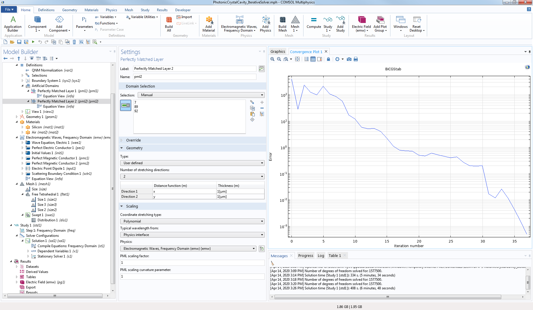 I am having a very hard time with trying to set an iterative solver that does converge for electromagnetic wave problems in 3D when using perfectly matched layers (PMLs). In particular I want to solve the emission of a point dipole into a photonic crystal cavity. I have done a precalculation of the eigenmodes (Eigenfrequency analysis) of my photonic structure, therefore I know at what frequencies my dipole should lie in the Frequency Domain simulation. The eigenfrequency analysis runs well with a direct solver (I think it is not possible to run it with an iterative solver, although that would be EXTREMELY HELPFUL)