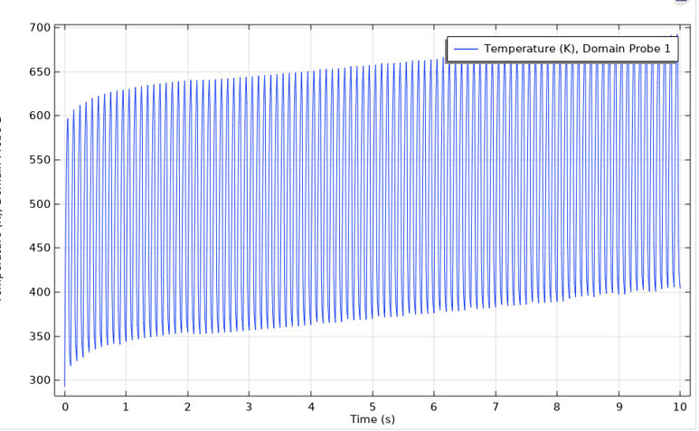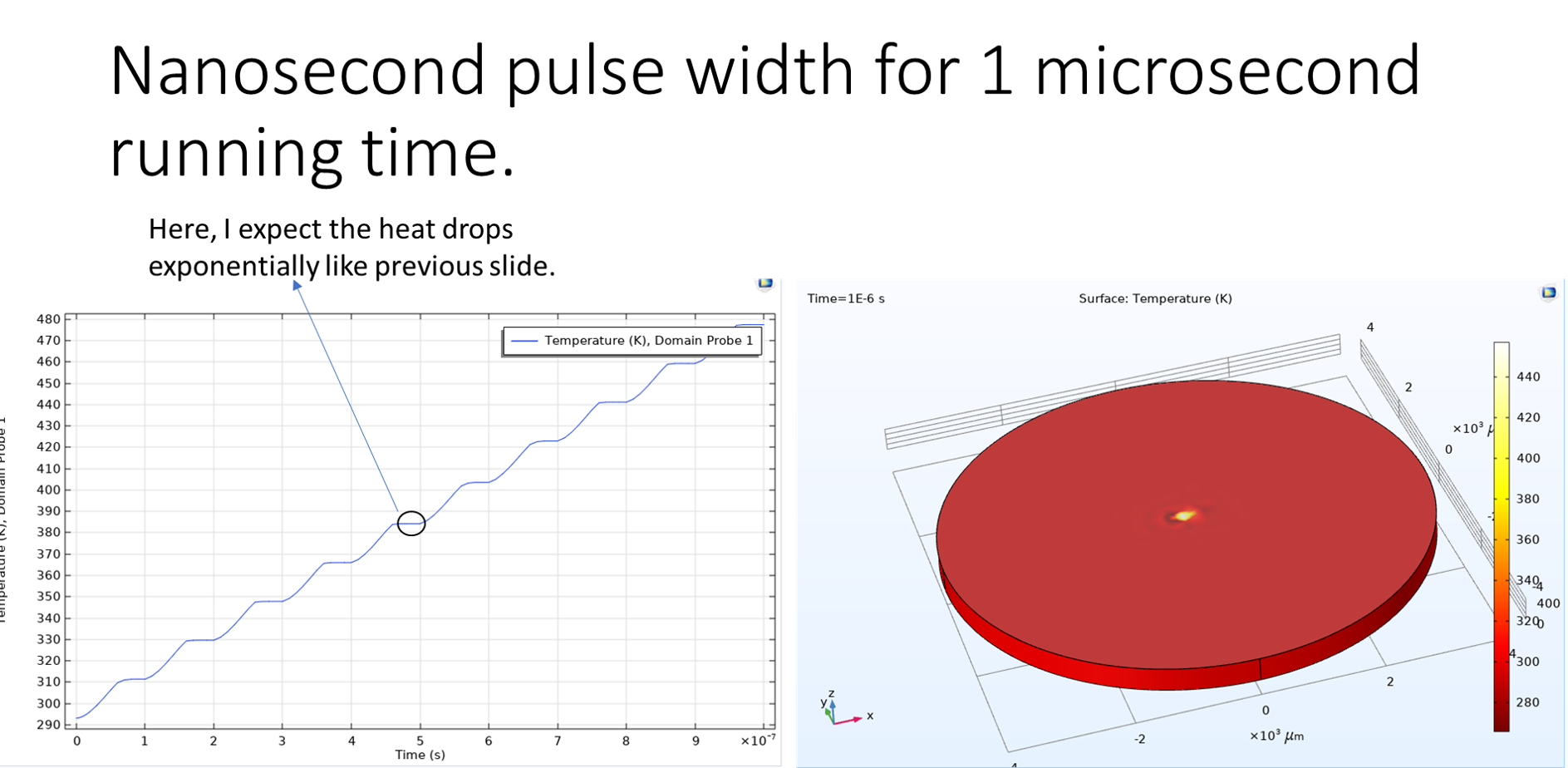I am simulating pulsed laser material interaction. When th pulse duration is in milisecond range, I would get reasonable resutls. I mean as it would be expected the heat will be dropped down in off time of pulse. However, when I go to nanosecond and microsecond range, the heat won't drop down in off time (see attached figures).
