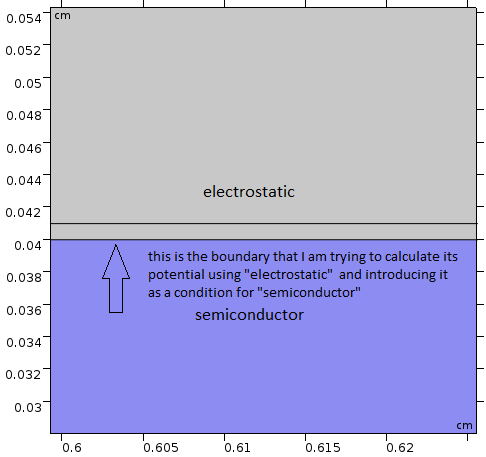 Hello, I am simulating an isfet. I am using "semiconductor" and "electrostatic" physics for my geomtry. What I am trying to do is to compute an electric potential for a surface that is adjacent to my semiconductor by using "electrostatic" physics. Then, use this potential as a boundary condition for computing "semicondutor" . I have tried pointwise boundary condition" and have set the condition on my boundary to (V-V2) . (V is dependant variable in semi and V2 is dependant variable in es) . but it seems boundary condition is not effecting the solution. In general, How can I use a dependant variable from another physics (electrostatic) interface to set boundary condition for a physics interface (semiconductor) . I have attached a photo as well. There is no multiphysics for this. I truly appreciate if someone guids me... Thank you