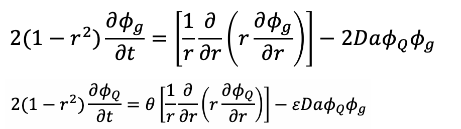 I am working to solve the following two equations in the attached images in COMSOL for a non-dimensionalized reaction diffusion problem. I am using the coefficient form PDE module in COMSOL 5.3. For some reason, the result I obtain is vastly different depending on if I define theterm to be inside d_a (the damping coefficient), or if i divide the whole equation by