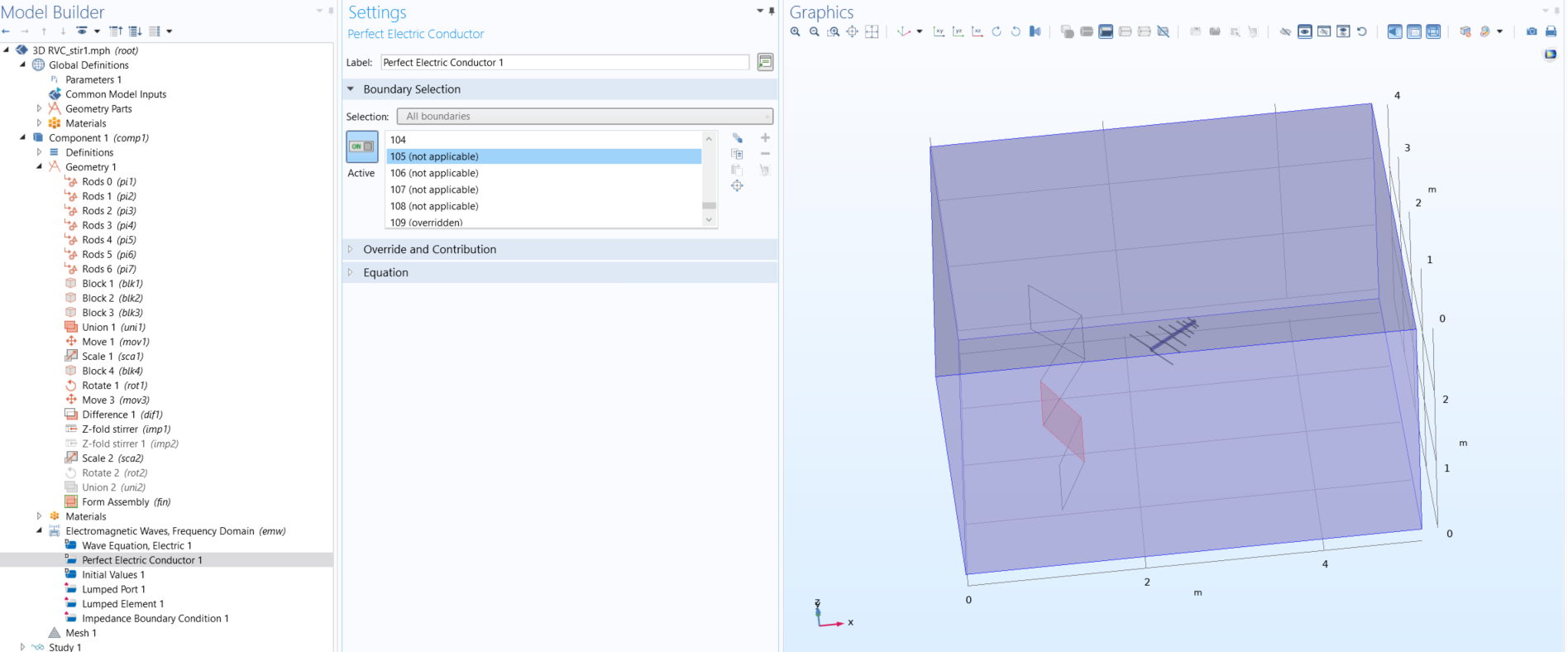 Also I would like to model the electric field in the room for two different stirrer rotations. I have had no succes in finding a way to do this. The most similar problem I found was a microwave heating problem with a rotating dish on the bottom which used identity pairs and a rotating domain (https://www.comsol.com/forum/thread/234941/applying-moving-mesh-rotating-domain-in-microwave-heating). Though I dont think I can use this as my mode stirrer does not have overlapping faces that form identity pairs. The ugly solution would be to save the system in different files for every stirrer position and solve the models seperately. Though comparing the solutions would be more tiresome.