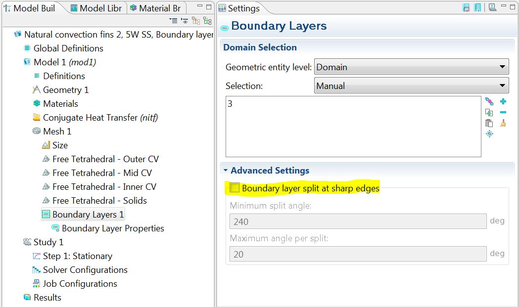 Dear Mr.Ivar I can simulate 2D model right now but my 3D simulation has this kind of error as shown below. Failed to create boundary layer mesh. -Detail: Could not shift boundary node at all It occured when I choose Element size from "Fine", when I chose "finer" it showed Boundary mesh must consist of triangular only. -Domain: 1 Try converting to triangular on these faces. -23, 39 (both are top circular faces from two cylinders) Then I change from "physics-controlled mesh" to "User-controlled mesh" and used "Swept" mesh from one circular face to another face of both cilinders with prism face meshing, but it said that "Source and destination faces must be specified." and cause an error in that damain. Did I do something wrong? Sincerely yours Kittatat Suphakulwattana