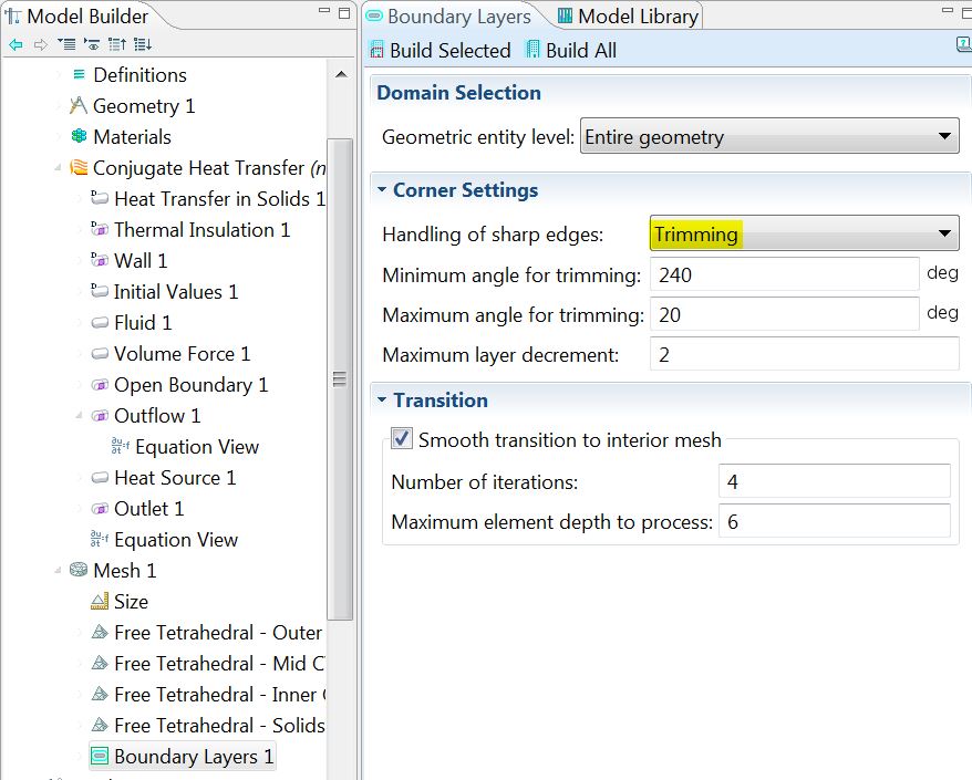 Hi there here is the solution for you: Prelude: I to have encountered that same error so many times when i modeled 3D geometries yet almost never when modeling 2D geometries. Why? COMSOL is trying to patch over the sharp corner diagonally in order to better/more smoothly mesh over the geometry in a way that will enable better representation of flow gradients over a corner. all that is excellent and another reason why i have so much appreciation for COMSOL developers as they are actual Mathematics/Engineering/Physics professionals. however, the problem is that doing this sort of "patching" is quite simple in 2D but very difficult in 3D, unless the geometry is very specific and of the kind that will not bring the meshing algorithm into collapse upon itself (due to impossible clustering of such elements). (remainder: the higher the physics-gradient present at geometrical location, the denser the mesh you will need to "capture" and depict that phenomena using FEM, for reasons related to Element order). Solution: all you need to do is: Ver 4.2a ==> uncheck the split boundary layer check box (see pictures attached) Ver 4.3B==> choose the trimming option from the drop menu /Engineering works for me every time :)