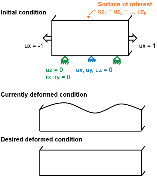 I have a part which contains an initially flat boundary surface (top surface in sketch). Upon application of boundary conditions that do not act directly on that surface, the surface moves and deforms.
