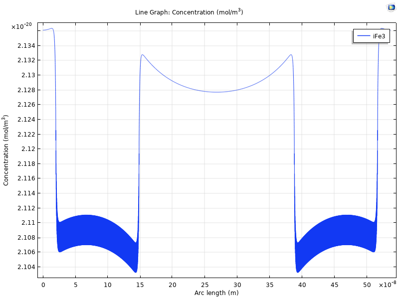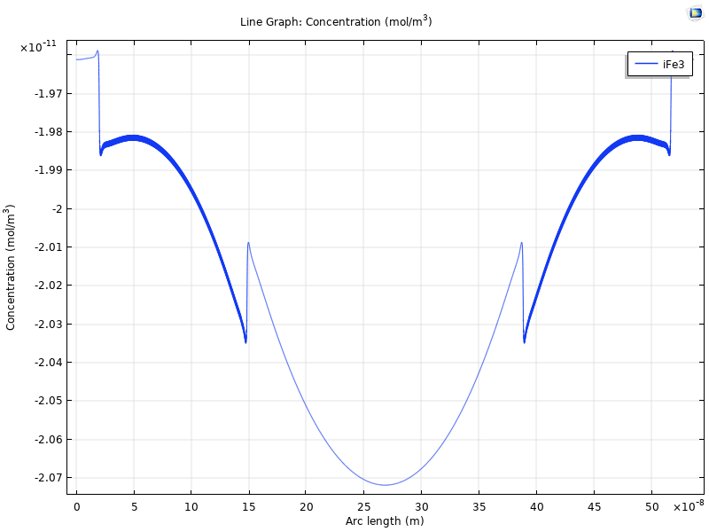 The domain is very small, I'm attempting to model the diffusion and migration of vacancies and interstitials in an passive layer. (Some further information here if you're interested http://dx.doi.org/10.1016/j.electacta.2012.02.008 ). After looking at the data to try and produce the plots requested, I've established that none of the mesh elements appear to be negative concentration. However if I plot the concentration along the outer boundary, or integrate along it I am given a negative concentration. See plots attached. I'm now thinking that this is a discretization issue as the concentration gradient is large at this boundary and the concentration should tend to zero. Perhaps the gradient across the mesh element is overshooting in the stationary case. I don't understand why I get different results between the solvers though.