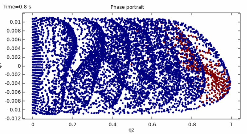 I am using the particle tracer module to analyze the axial mixing performance of a static mixer. Particles are being injected at the inlet at t=0, 0.1, 0.2, ... 0.8. During post processing results, I am using a 2d Plot group of a phase portrait along a longitudinal cross section of the static mixer (as shown in the attached image). X-Y plane is the cross sectional plane, Z is the axial.