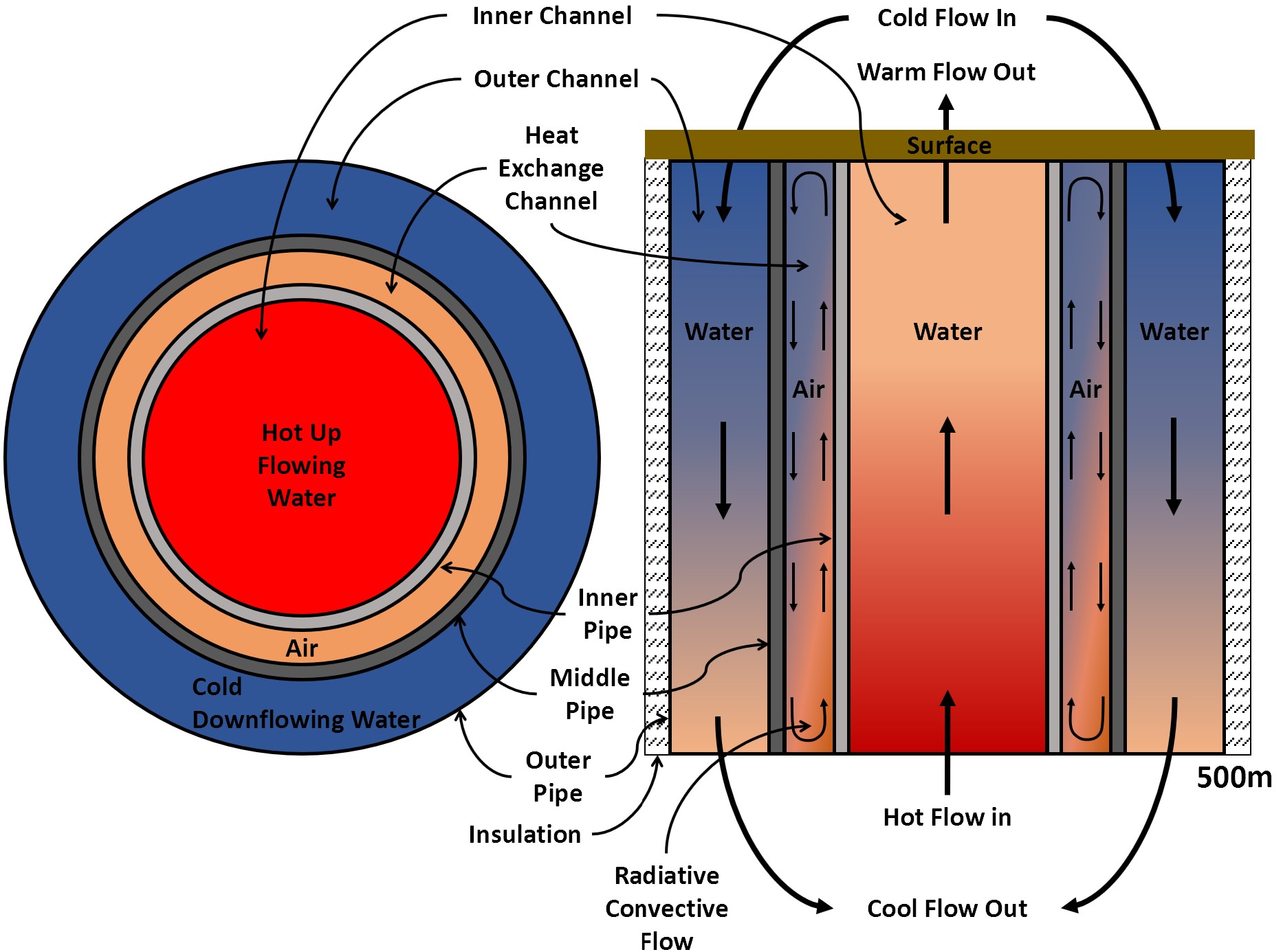 I am simulating heat exchange in 3 concentric pipes across 500m of vertical flow. Cold water enters on the surface and flows down an outer channel, which is formed by the outer surface of the middle pipe and the inner surface of the outer pipe - representing perfect insulation for now. Hot water enters at maximum depth and flows up an inner channel, which is formed by the inner surface of the inner pipe. A 3rd "heat exchange" channel is formed by the outer surface of the inner pipe, and inner surface of the middle pipe, and is a sealed volume that contains various fluids - air and water for now. Attached is an image that shows what I am trying to model.