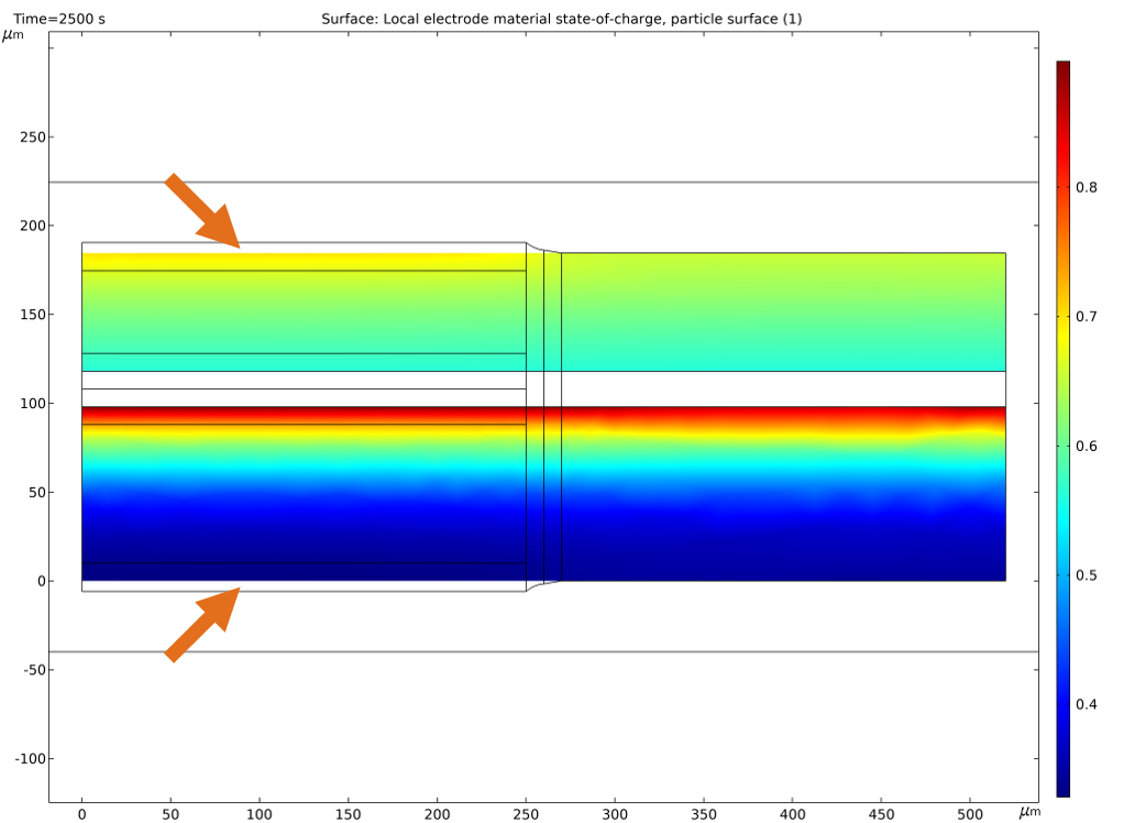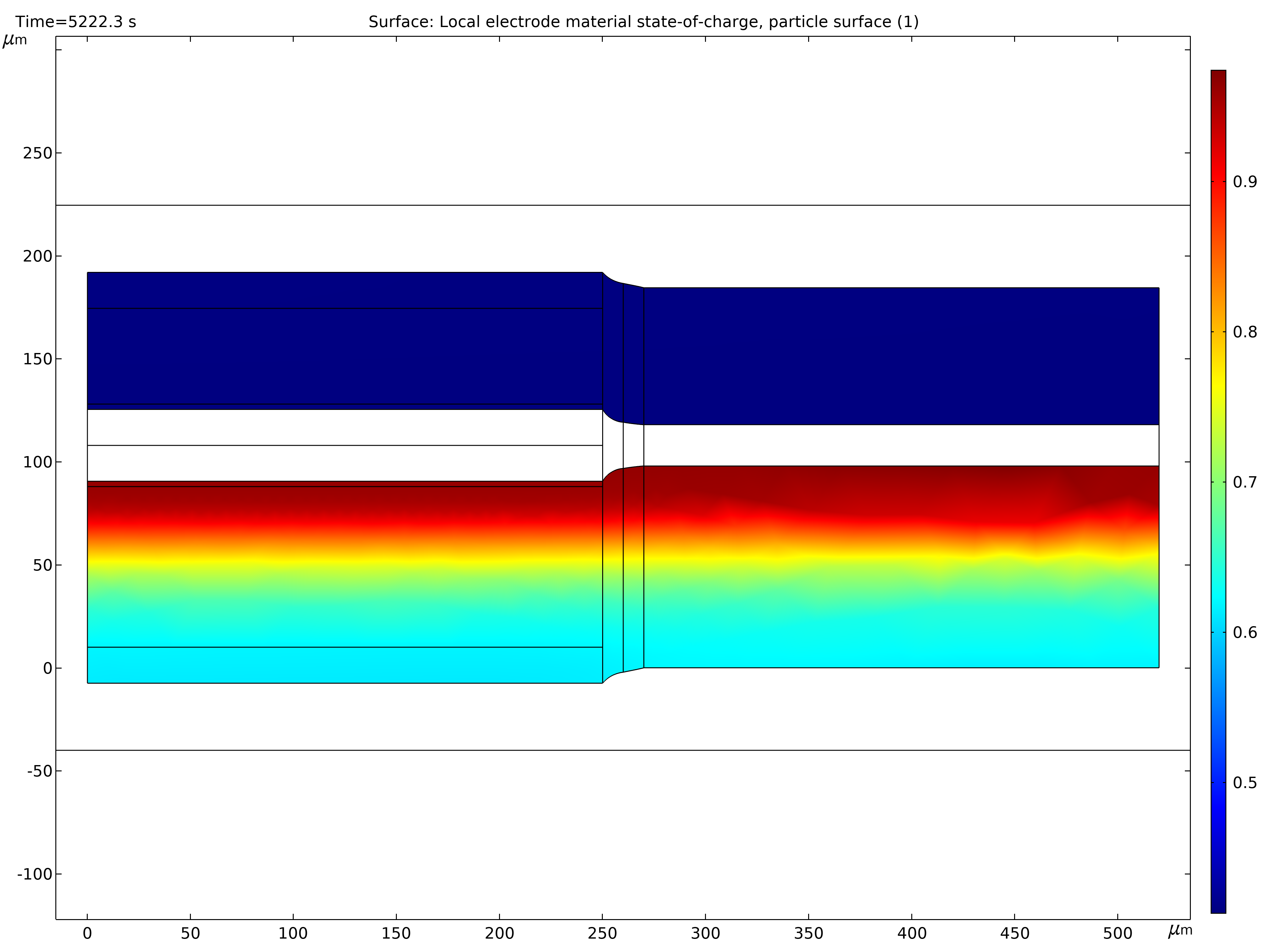 The problems is that the SOC is plotted only in the area of the non-deformed geometry. It does not cover the area where the electrodes expanded. It seems that the expression of the SOC it is not evaluated in the spatial frame of reference (x,y). (See attached picture)