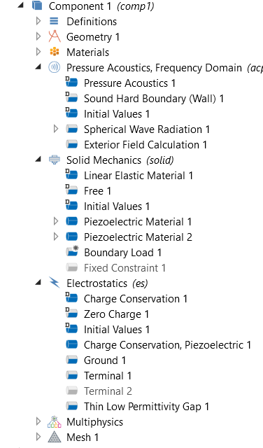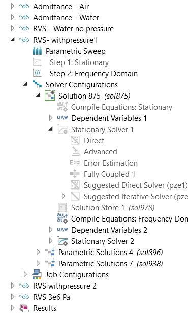 In order to do it I created a study with two different steps. One of them is stationary and the other one is frequency domain. I applied a boundary load to the piezo sphere in order to simulate the ambient pressure under stationary solution step. After that, I swept the frequency to get RVS results of it. However, the results are not satisfying. I tried several approaches for pressure, such as initial conditions etc. I couldn't find how to measure the RVS of the transducer. I added the physics and solutions that I used for the RVS measurements with the images given below.