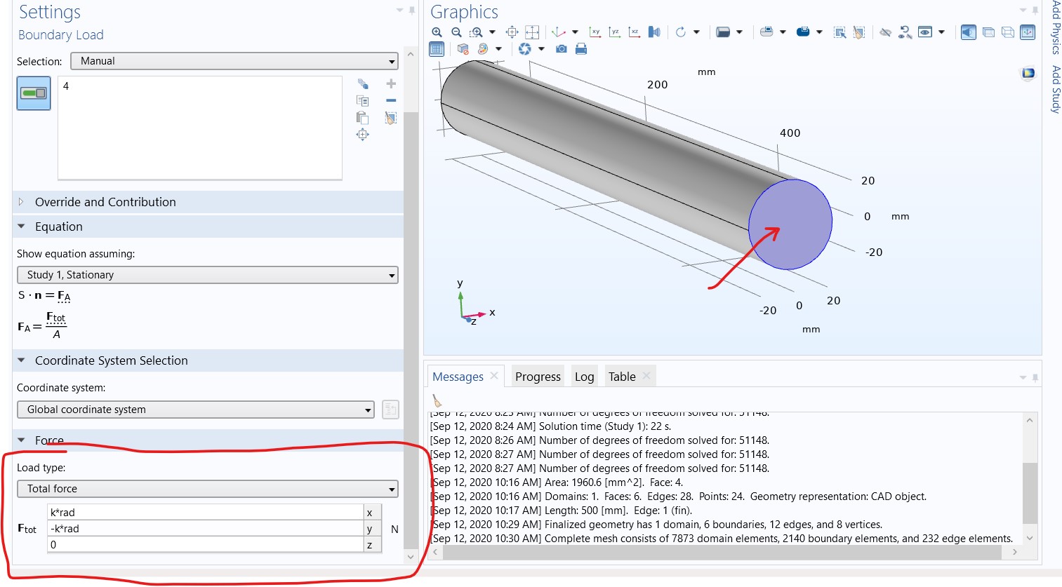 Hi Edgar, I have cylinder of radius = 25mm, as you said earlier about constant, I have calculated its value and defined as parameter. While applying load, I have specified Fx = constrad and Fy = -constrad. But I am getting error in solution saying operator (range) is not valid in analysis. I am attaching screenshots of it. PLease have a look and help me.