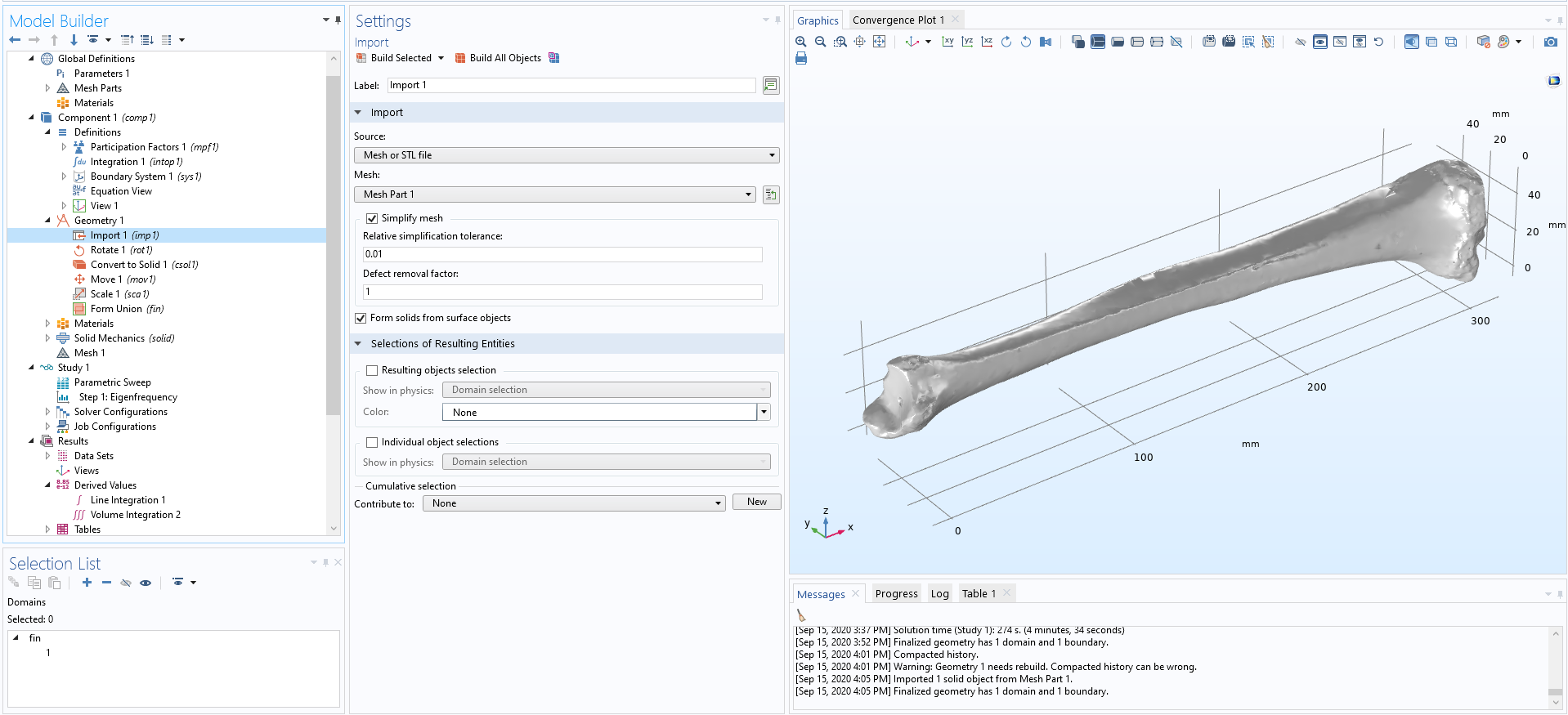 When I imported the file into COMSOL, I created the geometry from the simplified mesh, and got the model inline with the axes and the ends of the bone roughly at the origin. The resulting geometry looks thus: