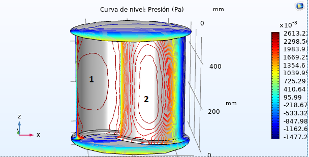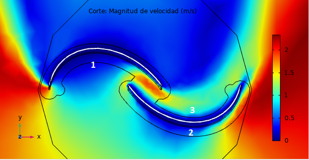 Hi! I am working on a vertical-axis wind turbine and I'd like to compute the forces exerted on its blades by the wind. In order to do so, I am performing CFD simulations on my wind turbine in the following manner: I Import my 3D geometry from SolidWorks, then I build a block to simulate wind tunel, I set up acrylic plastic and air as materials for the wind turbine and wind tunel respectively. Finally, I add laminar flow physics and set up its boundary conditions with an inlet wind speed of 2.04 m/s. No turbulence model is used. Then, to compute forces, I am integrating the pressure magnitude (p) along to the normal of the surface of each of the blades of the wind turbine. From doing this, I expect to get positive pressure, and therefore, positive force on the surfaces labeled as 1,2 and 3 (see Figures attached), which are the blades surfaces where the wind impacts directly (1 and 2) and where part of the wind flow is deviated (3). But I am actually getting negative values of pressure and force in the blade 3. Does anyone know why I am getting negative values of pressure and force on the sides of the blades that are "behind" the wind flow? I'd appreciate any help, thanks.