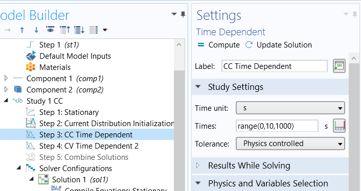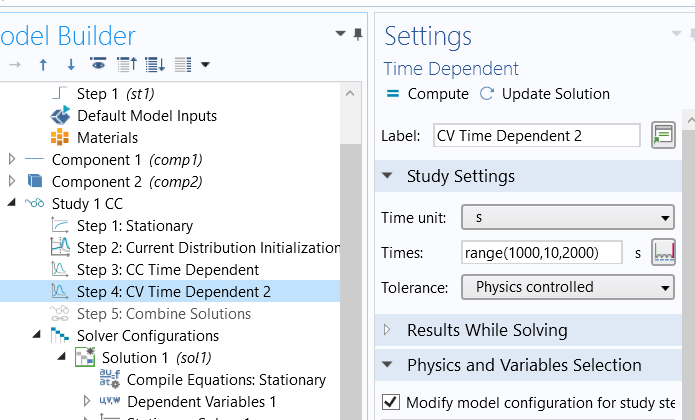 Follow the instruction of this will help: https://reurl.cc/KjorNg Also to combine them up at the end of the computation: Combine Solutions. For example, to combine CC charge and CV charge, I have to combine the solution stores of them and get a combined solution in "solution 1." For the rest, I combined the previously generated sol1 with the new sol store and so on. Please refer to the attached mph files.