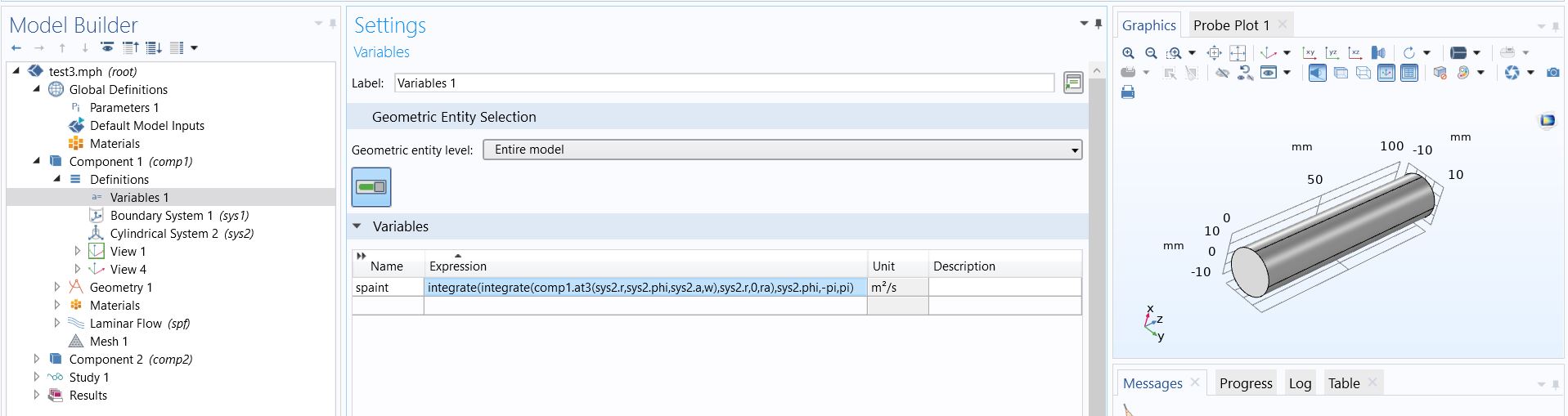 I have a pipe geometry aligned with the z axis shifted in x and y. I want to calculate the men fluid temperature through the pipe. I use the integration operator with the spatial at expression (through a variable). The syntaxis i try is like: integrate(integrate(comp1.at3(sys2.r,sys2.phi,sys2.a,Tw),sys2.r,0,ra),sys2.phi,-pi,pi). The frame of the sys2 cylindrical coordinate system is spatial. The axis directions are checked and are correct. I can integrate if the pipe is made as an axisymmetric study but is the study is a 3D component, the integral fails. If i build a square geometry and evaluate it in the same way - using the integral syntax, i get the right result (using the default coordinate system).