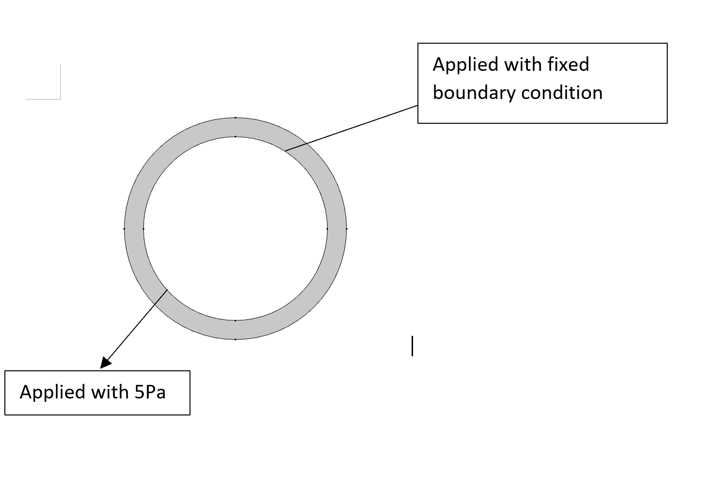 Then, I attempted to address the problem. Initially, I was thinking there could be an error in the direction of pressure and hence I tried to apply a fixed boundary condition to one edge of curve and apply 5 Pa to another edge as attached. Then, from the simulation result as attached, I realized the positive pressure direction is directing radially outward, so there is no problem in the direction of pressure that I have chosen previously. However, I also realized that the reason that the simulation issue occurred is there was no fixing boundary condition as I discussed with you last meeting.