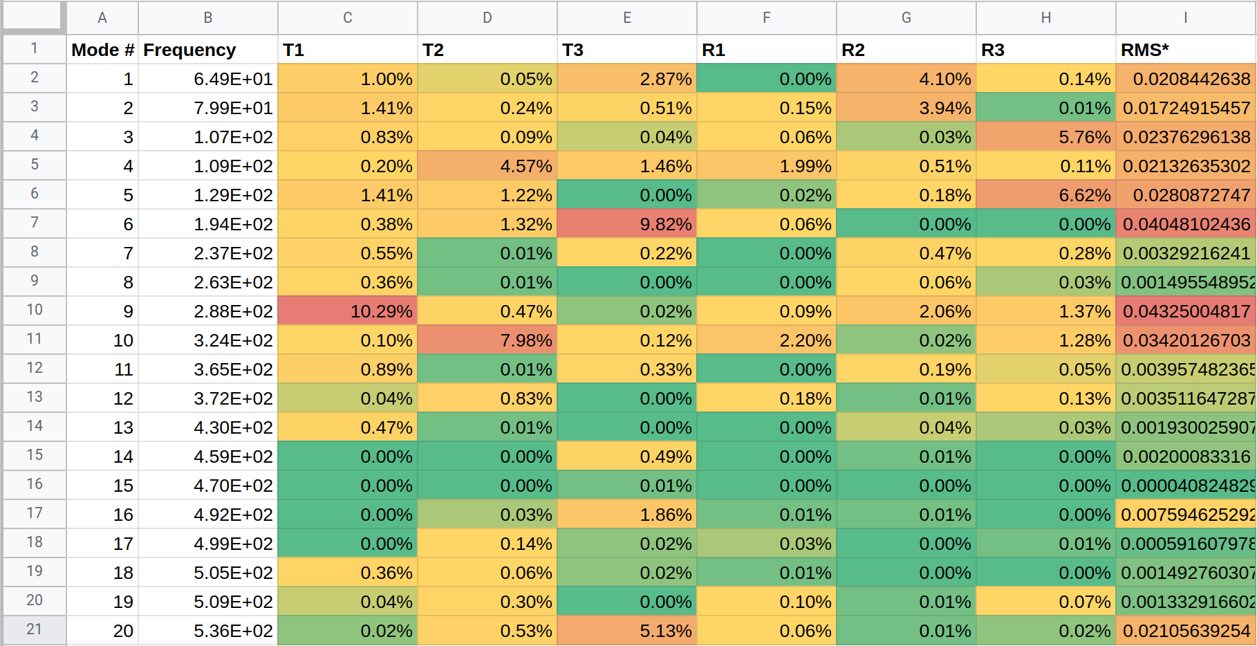 Please see the attached image of frequency analasys results with an added column summarizing the information with a single measure, and highlighting via. conditional formatting (cell-color) which eigenfrequencies are relevant.