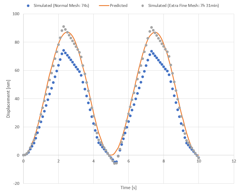 As you can see in the attached image though, things aren't going quite as planned. With a "normal" mesh, the solution exhibits a weird blocky behavior, and does not make it up to the proper displacement amplitude. I can increase the mesh size to Extra fine to fix the second problem (at the cost of hours of computation time) but the same blocky behavior still exists. I have also tried decreasing the tolerance by several orders of magnitude. While this does slow down the simulation considerably, the solution is ultimatly the same leading me to conclude that this is not a time sampling issue. The physics here don't seem super complicated -- it's a very small displacement in a gelatin block that is 4 orders of magnitude larger than the displacement. Furthermore the sine wave is very slow -- the period if 5 seconds.