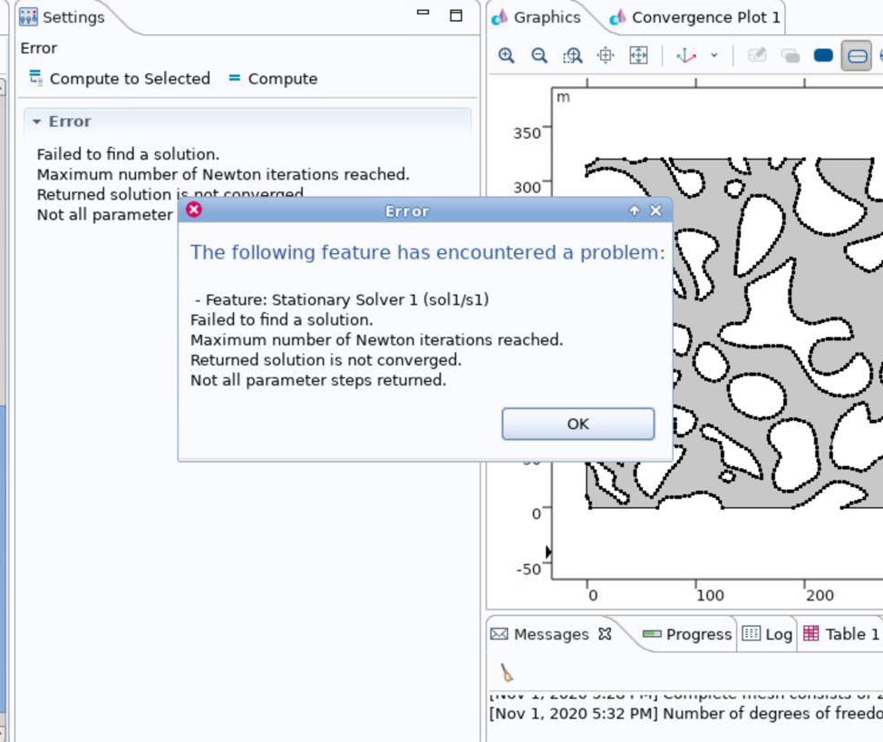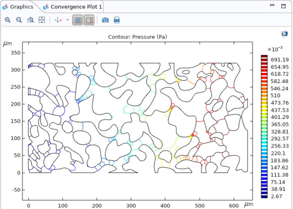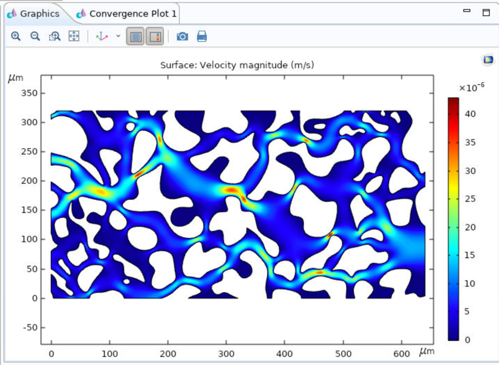 Hi everyone, I have recently replicated the Intro to Porous Media tutorial in COMSOL to build a baseline model that I can eventually add modules to and turn it into a model for chloride migration in concrete. The first time I ran the simulation, I did it exactly the way the demonstrator did it in the video tutorial (without NPP equations, only including the Creeping Flow module). The results were a surface velocity plot and contour pressure plot, with a convergence plot that did reach convergence. (screenshots attached of the 2 plots and the convergence plot that belongs to this simulation)