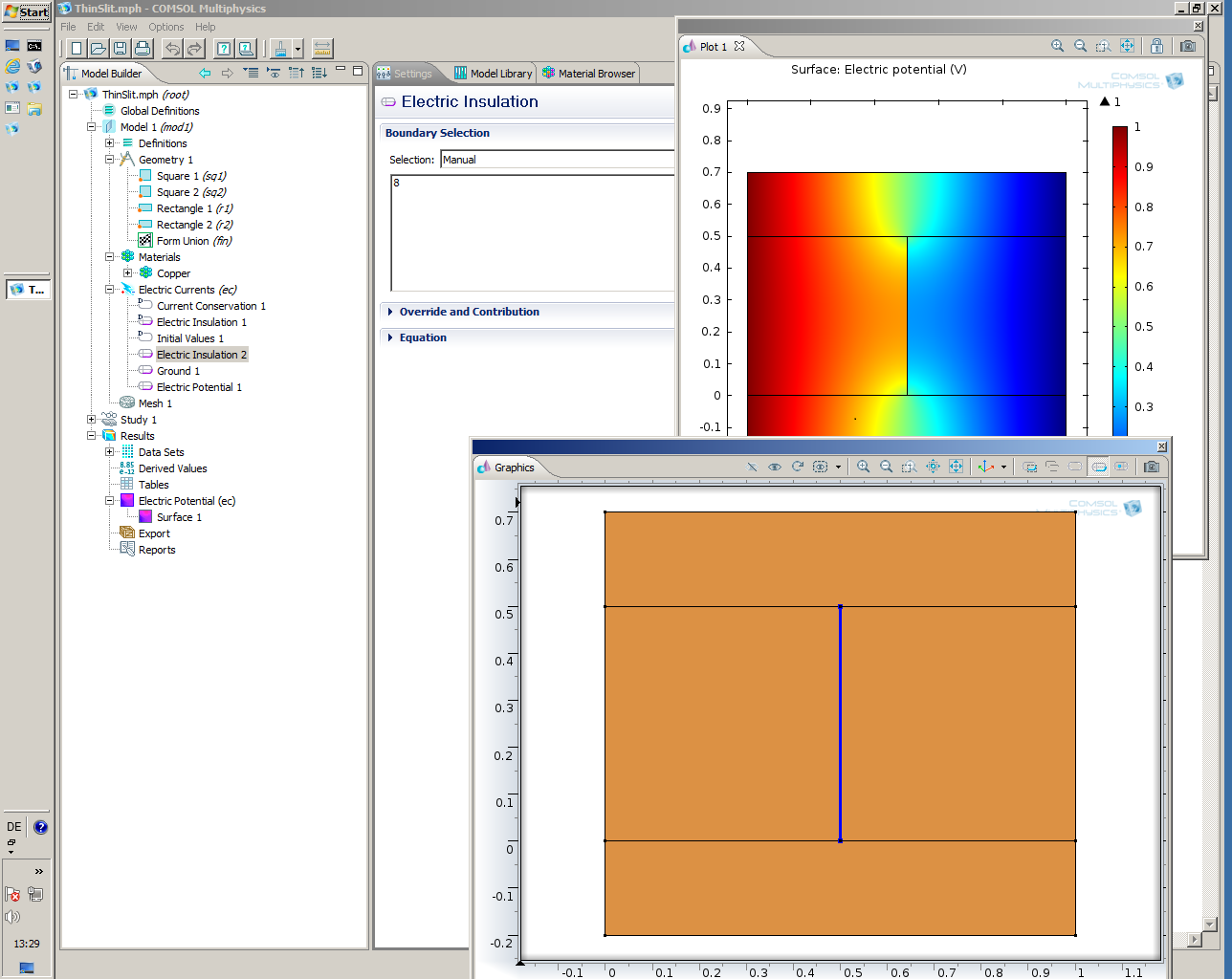 Here is the screenshot. I assembled those 4 domains, all are copper. This way I could set the internal boundary to insulation. Left and right boundary are set to 1V potential and ground. The other internal boundaries are continuous as default.