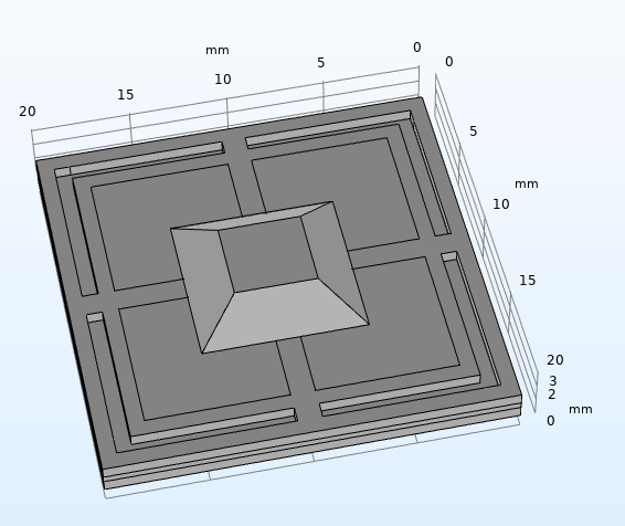 For my master thesis I want to determine through simulation the displacements due to applied forces. The sensor has 4 bottom and 4 top electrodes that do not complete align along with a bump on top which will be where the force is applied.