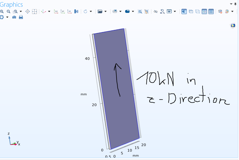 I wanted to look into shear stress in an extremely easy example, a beam with x=1mm, y=20mm and z=50mm, which is pulled in z-Direction via boundary load of 10kN (I have attached some pictures for easier explanation of the model) and has a fixed constraint at x=0.