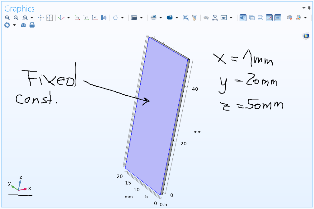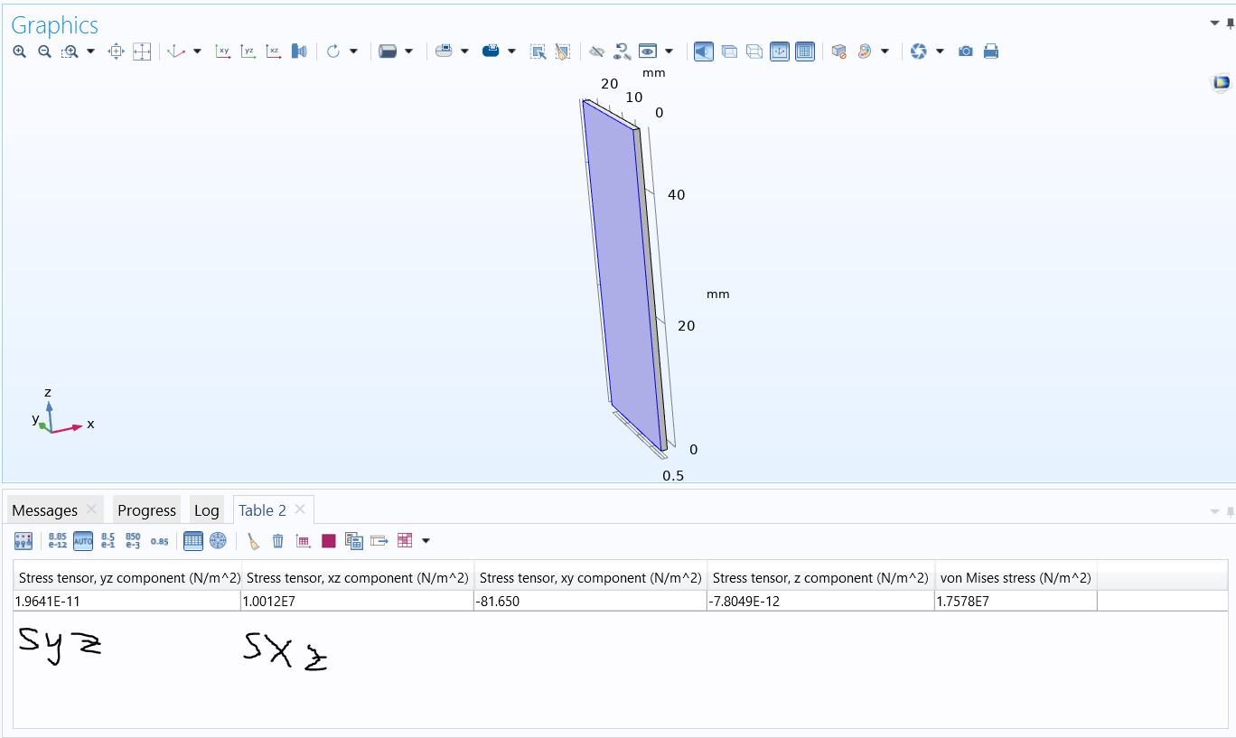 The material was modified to have an extremely high Young modulus of 1e15 and a poisson ratio of 0 to only have a vertical deformation. The resulting shear stress in the yz-plane at x=0 should therefore be tau = F/A, which would be 10E7 N/m^2 (With an area of 20x50mm). When i evaluate surface averages at the fixed boundary x=0, y=20, z=50, for different stress tensors solid.syz, solid.sz,... , only the solid.sxz tensor results in 1E07 N/m^2 (I have attached results as pictures as well). Souldn't the resulting shear stress of 1E07 be in the yz plane, therefore solid.syz? Why is it that the solid.sxz tensor component gives the real result and all other values are completely different? I have tried it in different orientations and with real parameter values as well, but i cant seem to find the right tensor to display the shear stress. The bending momentum should be nearly 0 in this case as the youngs modulus is so high and poisson ratio is 0, so i expected stresses in all other directions than yz to be near 0 as well.