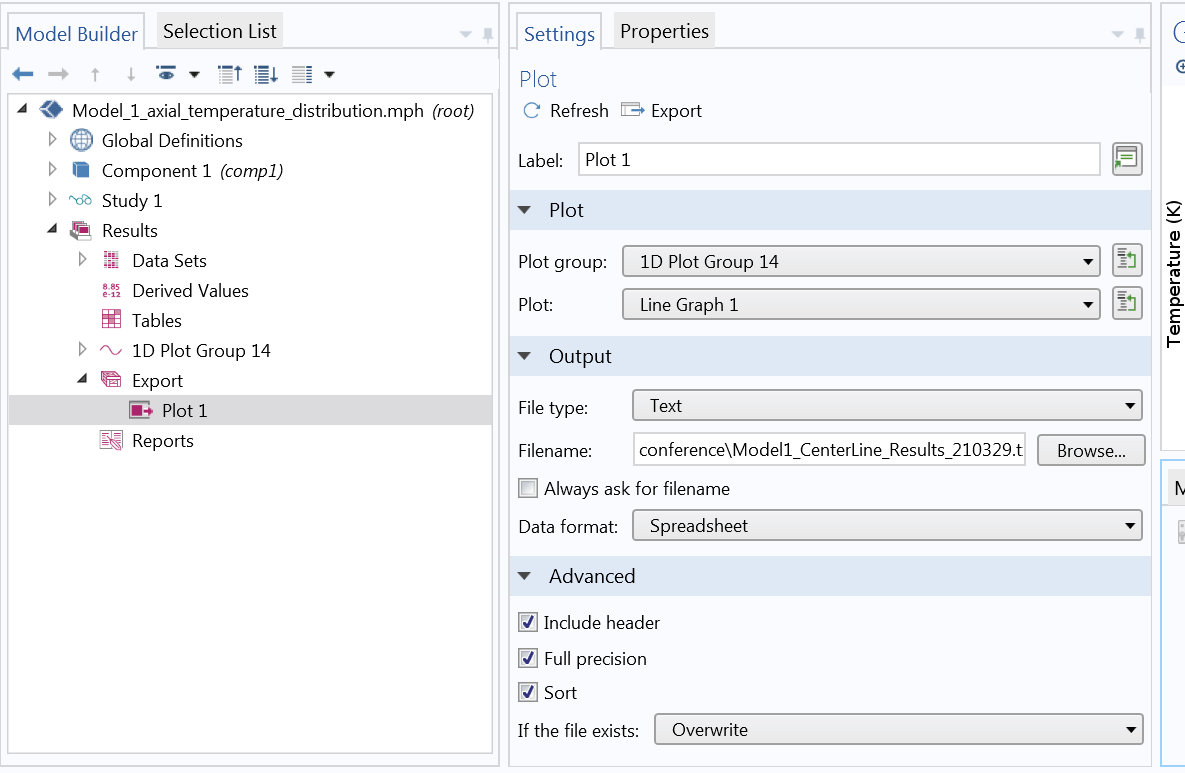 I created a cut line 3d and then a 1d plot group to look at temperature along the line. When I export the data as a text file, it outputs two columns, arc length along the line, and corresponding temperature. The values of arc length along the line repeat periodically, I assume for different temperatures / parameter value combinations. But it would be a lot easier to understand the data if I had corresponding columns for time and parameter value.