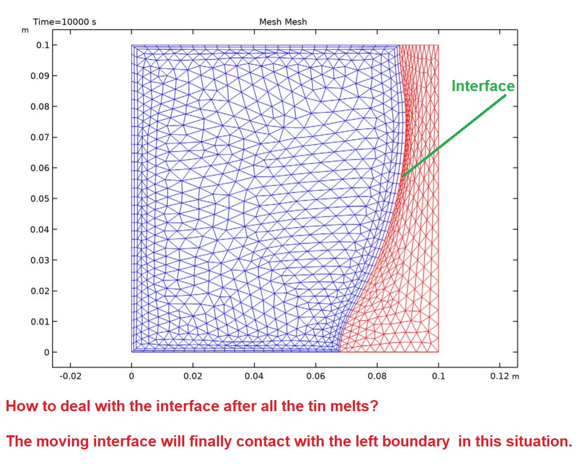 How to deal with the situation where all tin melt. In this situation, the phase change interface will contact with the left boundary and there will be a mesh error. Does anyone know how to handle this problem.