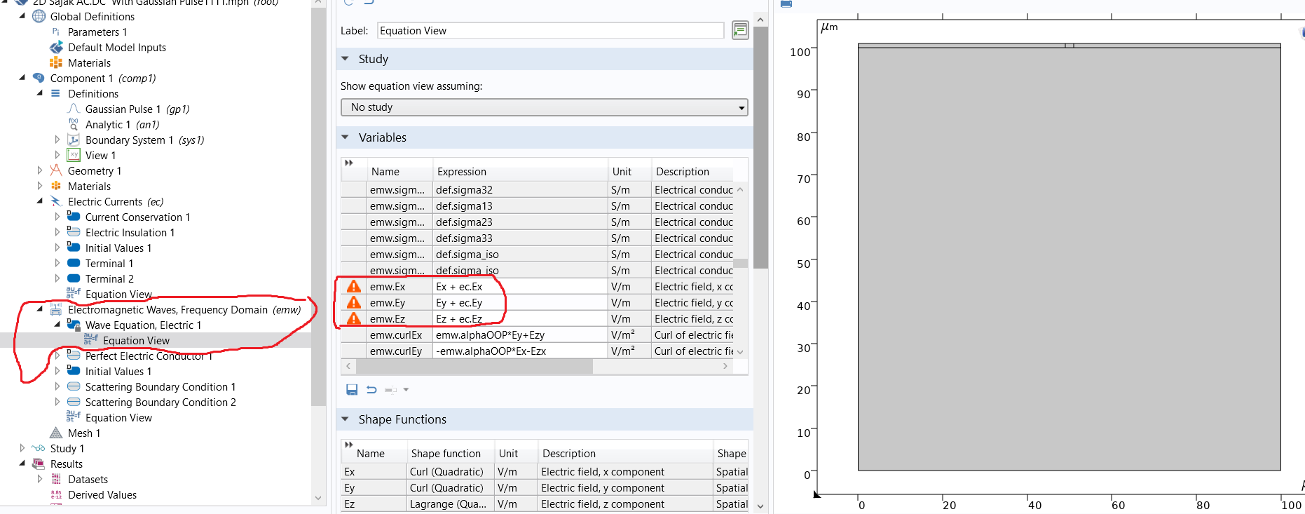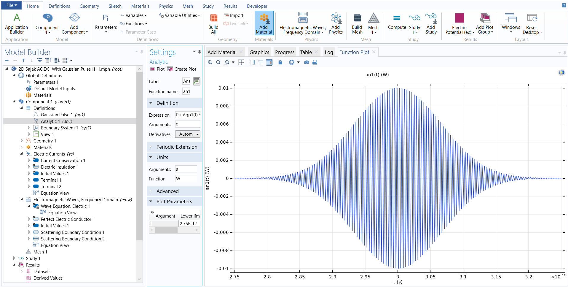 1) Should I run my study in Time or Frequency domain? 2) How can I do a manual coupling between AC/DC and RF Physics (because Comsol doesn't provide auto coupling between those Physics)? >> I tried to do that, I worked in Time Domain and I added the electric field of AC/DC module to RF module as it is shown in Figure-1 that I attached. I don't know whether if what I did was correct or not because I got values of AC/DC electric field in RF. 3) How can I set that laser pump in the right way. I built laser pump in terms of Average power of laser using Gaussian Pulse and Function (Analytic). Figure-2 shows the plot that I got from those functions. So, if what I built is correct, how can I use it in RF module to get laser pump? 4) What is the rightest way to get values of Photocurrent in those physics?
