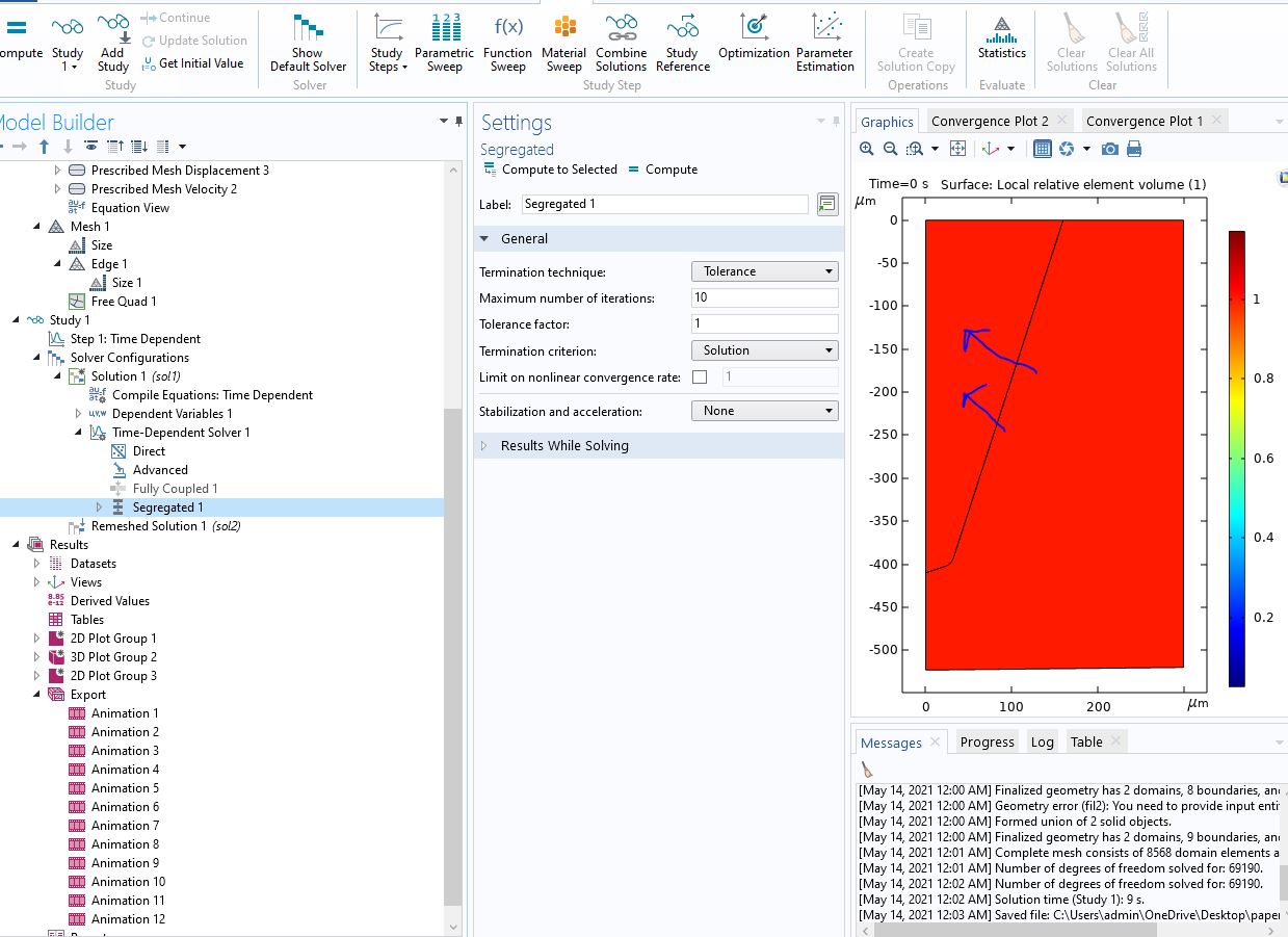 Hello all, I am trying to simulate boundary movement using the deformed geometry in my 2-D axisymmetric model attached. The boundary should move inside with time. The model is running fine for the initial 10 seconds but as I increase the time, I get the error " Repeated error test failures. May have reached a singularity. Time: 11.307408951189441 s. Last time step is not converged."