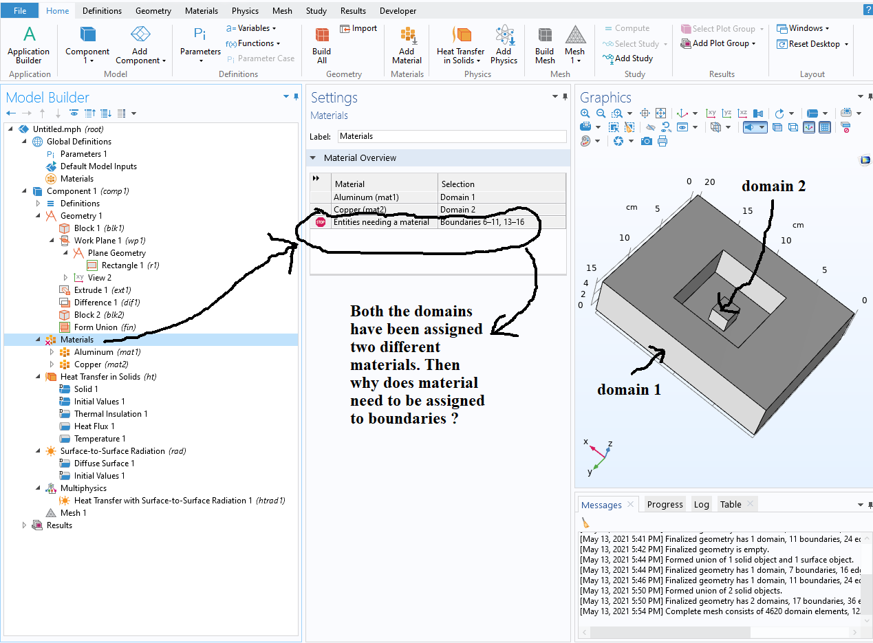 (1) I have two domains. I have assigned two different materials to both the domains. Still why do I get error saying that boundaries are needing material assignment ? Please see attachment (screenshot).